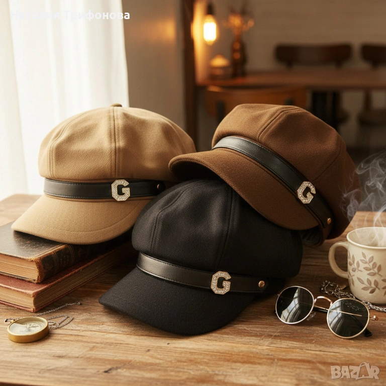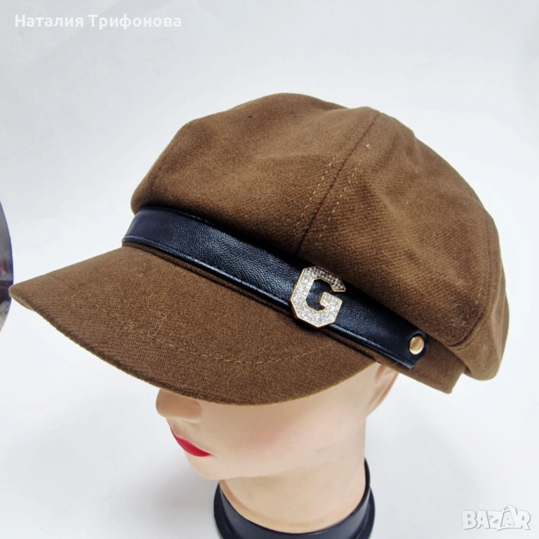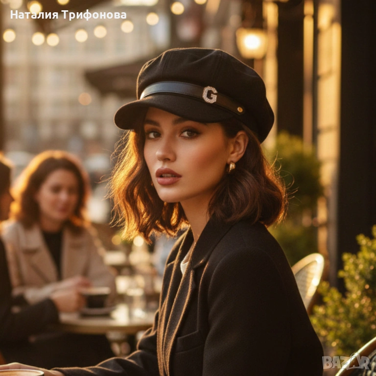 Елегантна дамска шапка тип фуражка с декоративна лента и метално лого