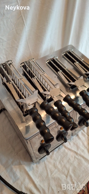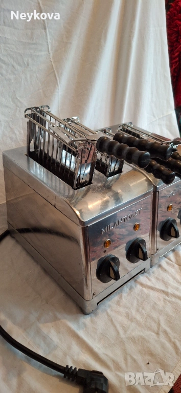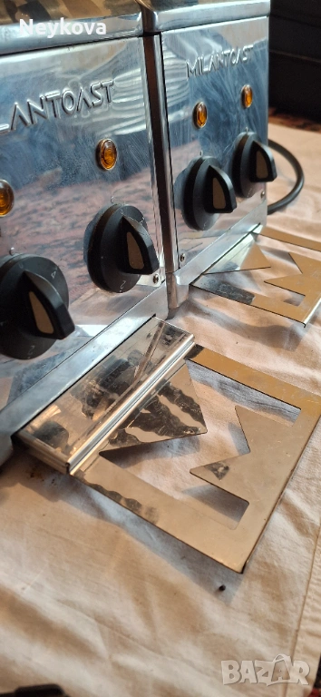 Изключително здрав, надежден и ръчно изработен тостер от италианската марка Milantoast. Моделът с 4 щипки е идеален за интензивна употреба както в професионални кухни, така и за ценители на качествената техника в домашни условия. Изработен е изцяло от неръждаема стомана, устойчива на корозия и лесна за почистване. С четири гнезда и автоматичен таймер, тостерът може да приготви до 120 филийки за час, без да прегрява. Много добре е запазен без забележки.