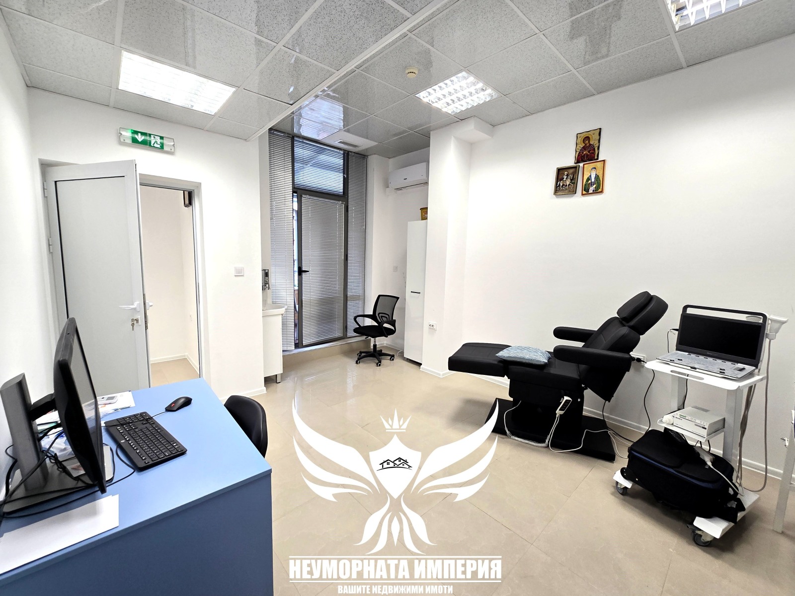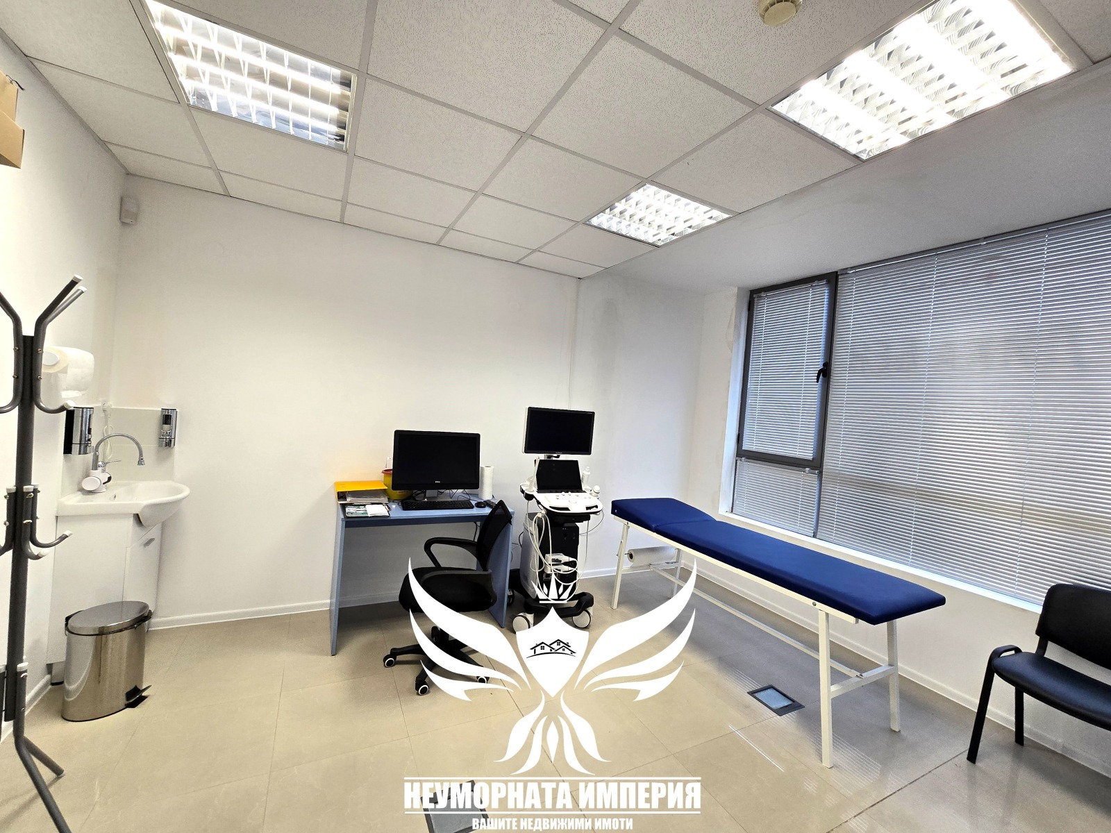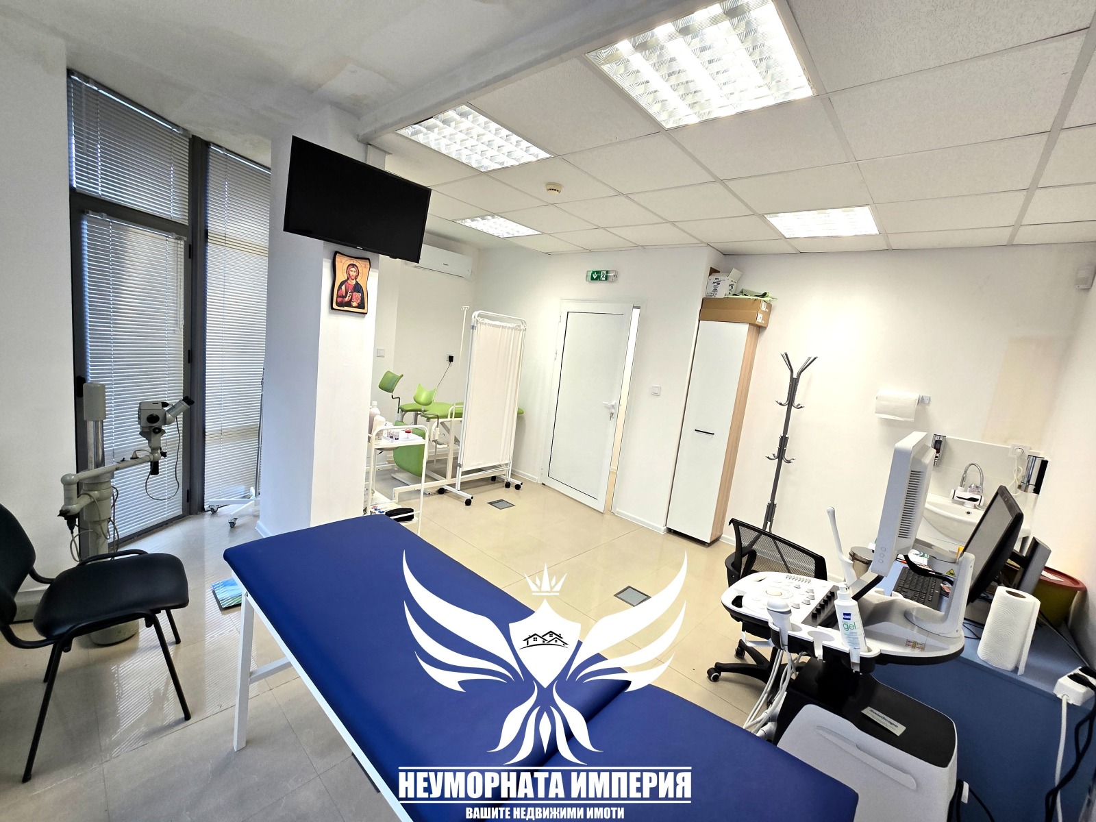 екстракраниални съдове и сонда кардиологична, електрическа кошетка, 4D АГ ехограф с две сонди трансвагилна и трансабдуминална, колпоскоп лед подвижни лампи, АГ кошетка гинекологичен стол, подвижна маса, хладилник, бюра, рецепция мебели, подвижна маса, пет компютъра, пет офис стола, посетителски столове, посетителско канапе и много други които не са добавени на снимките от другите офис помещения.Удобно е за разполагане на допълнителни мебели, уреди, машини и други спрямо нуждите. Във помещенията има лед осветление, равно шпакловани стени и боядисани еднакво, допълнителни контакти, ПВЦ дограма, монофазна ел.енергия с две партиди, права вода, теракот настилка, изолация на таваните със стените и други. Подходът до имота се осъществява чрез асансьор или вътрешно стълбище.В паркинга до сградата има свободни и безплатни паркоместа.Моля агенции да не ми звънят и не се отдава под наем.