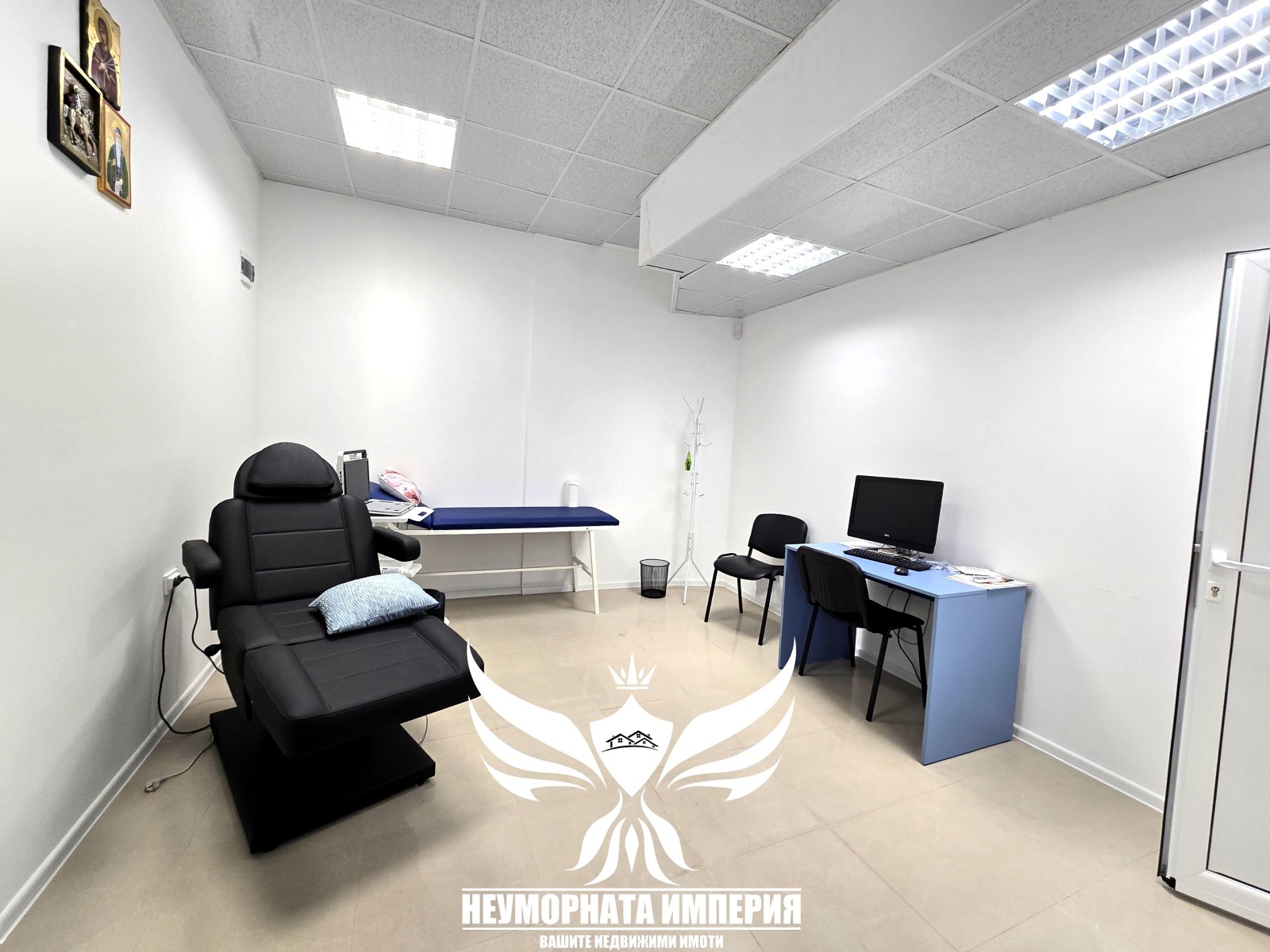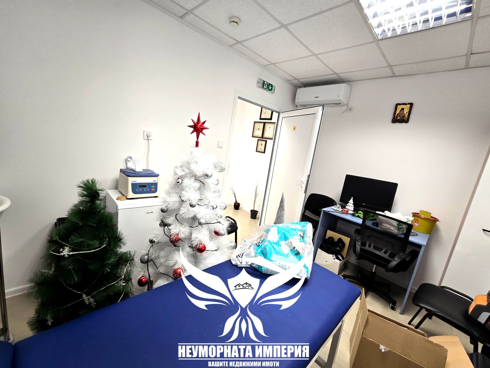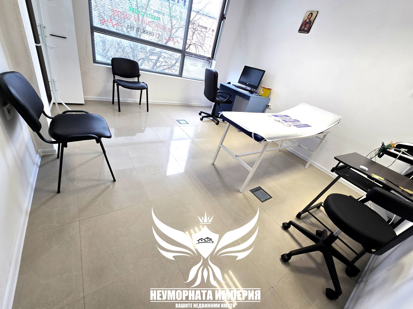 екстракраниални съдове и сонда кардиологична, електрическа кошетка, 4D АГ ехограф с две сонди трансвагилна и трансабдуминална, колпоскоп лед подвижни лампи, АГ кошетка гинекологичен стол, подвижна маса, хладилник, бюра, рецепция мебели, подвижна маса, пет компютъра, пет офис стола, посетителски столове, посетителско канапе и много други които не са добавени на снимките от другите офис помещения.Удобно е за разполагане на допълнителни мебели, уреди, машини и други спрямо нуждите. Във помещенията има лед осветление, равно шпакловани стени и боядисани еднакво, допълнителни контакти, ПВЦ дограма, монофазна ел.енергия с две партиди, права вода, теракот настилка, изолация на таваните със стените и други. Подходът до имота се осъществява чрез асансьор или вътрешно стълбище.В паркинга до сградата има свободни и безплатни паркоместа.Моля агенции да не ми звънят и не се отдава под наем.