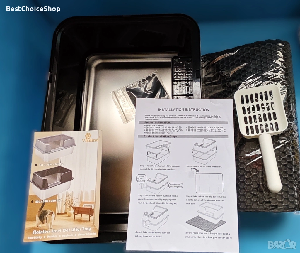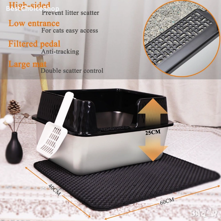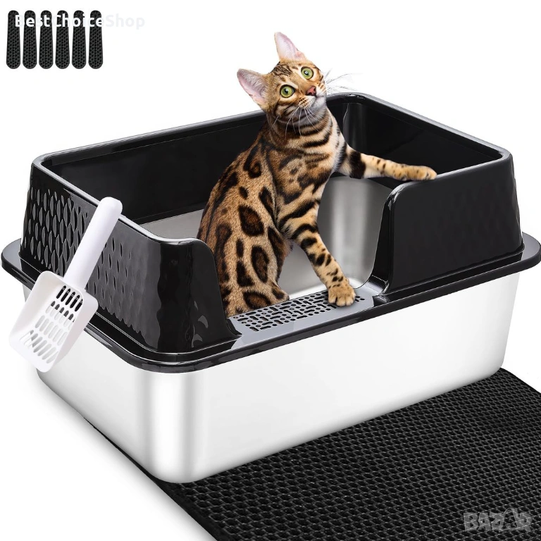 - Метален материал: Металната кутия за котки има дълъг експлоатационен живот - кутията за котки от неръждаема стомана е изработена от метален материал, което прави тоалетната здрава и издръжлива, а също така този материал предпазва от ръжда. Няма нужда често да сменяте кутията за котки.