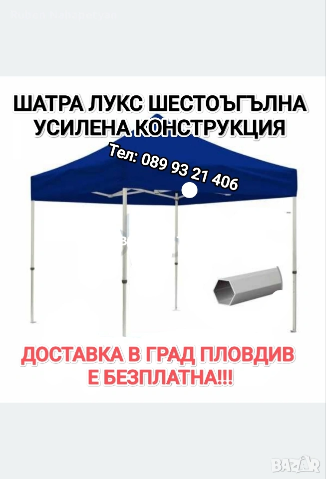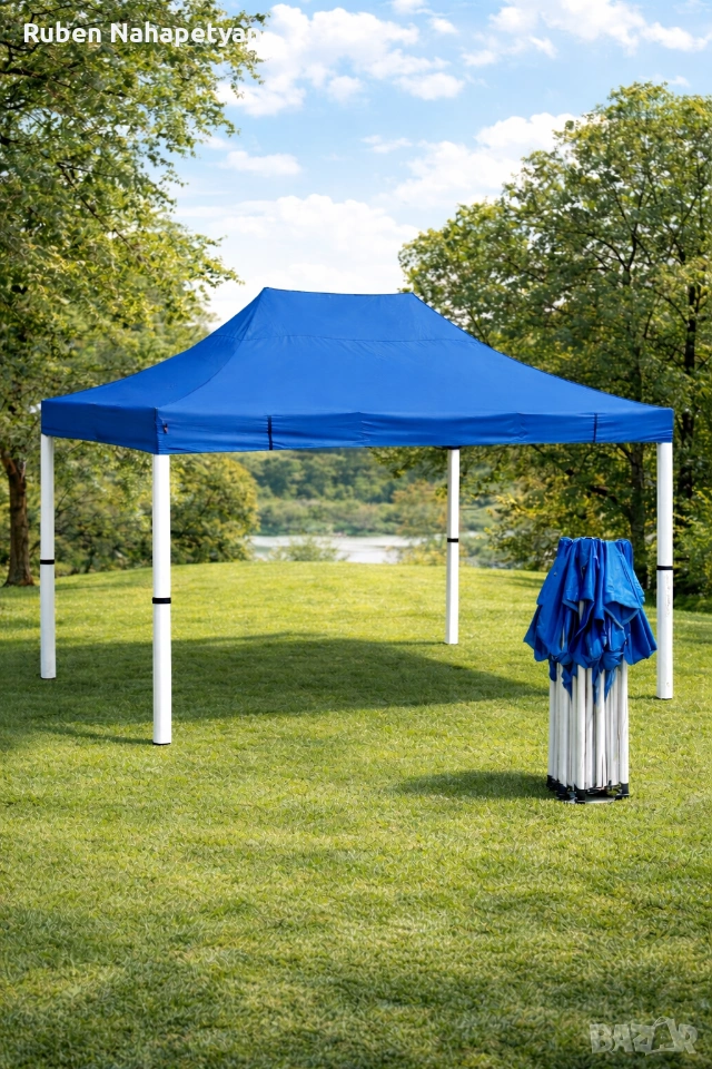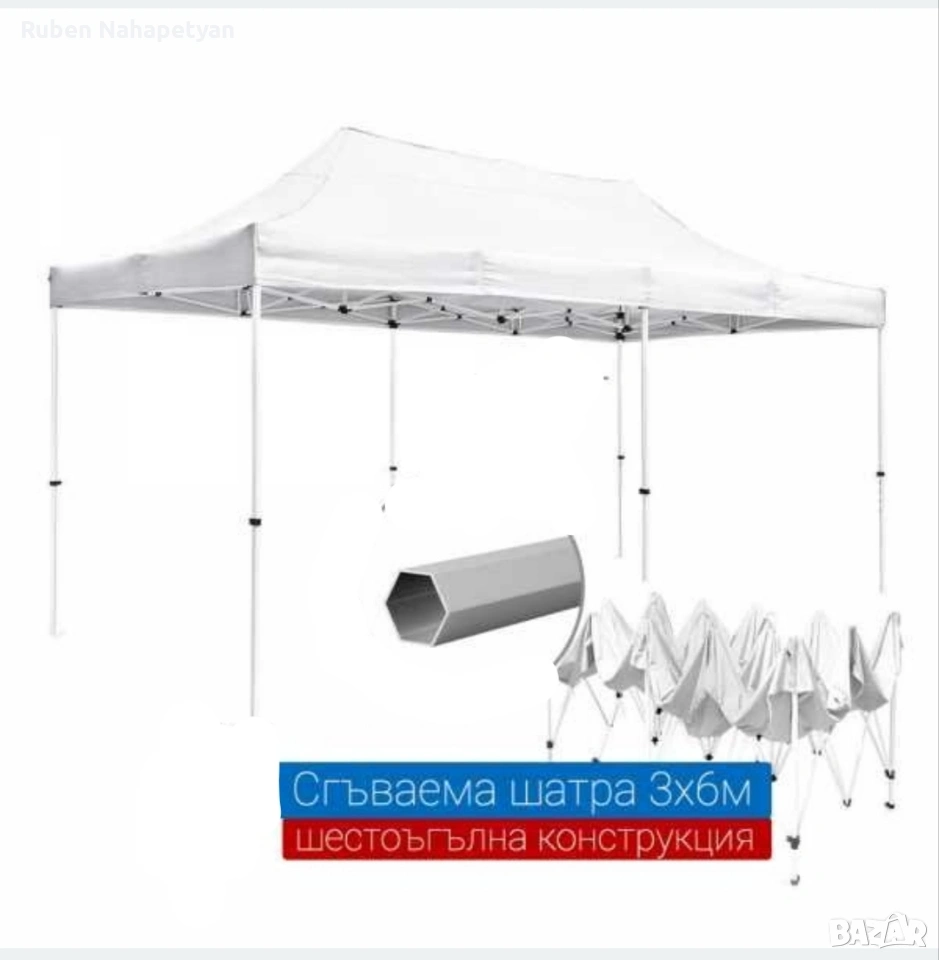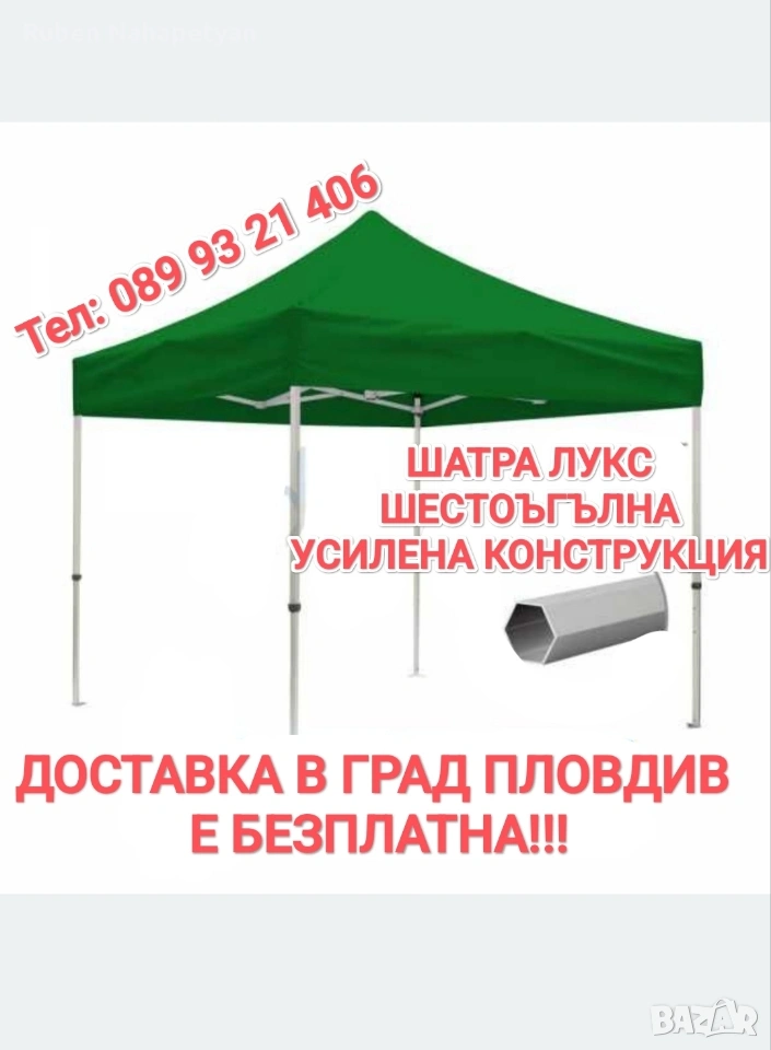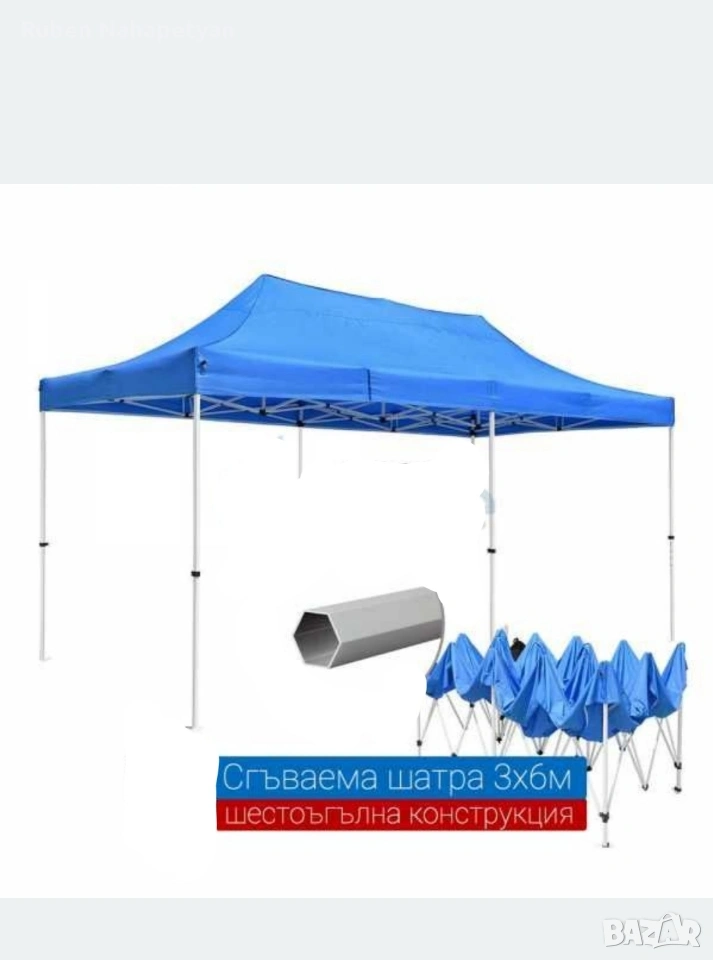 ОПИСАНИЕ Описание Сгъваема Шатра Хармоника с Гумирано, Непромокаемо Платнище Готова контрукция , хващате и разпъвате за секунди!! Покривало , платнище - гумиран полиестер , издръжлив на всякакви климатични условия, непромокаемо, промазано платнище Сгъваема шатра тип хармоника, подходяща за къмпинг, риболов, събития на открито като представления, сватби, рожден ден, панаири и изложения. Може дори да я поставите в задния си двор Налични цветове - зелен, син, бял, червен Размери: 3х3 метра, 3х4.5 метра, 3х6 метра Височина: 2.5 метра; Сгъваем механизъм; Метална конструкция Непромокаемо промазано платнище (издръжливо на всякакви климатични условия); Бързо и лесно разпъване Размери: Шатра. Черна подсилена конструкция, шагрен, неръждаема с непромокаемо покривало Шатра 3х3м бяло подсилена конструкция, неръждаема с непромокаемо покривало – 23кг-100 евро Шатра 3х4.5м -150 евро бяло подсилена конструкция, неръждаема с непромокаемо покривало – 30кг. Шатра 3х6м -195евро бяло подсилена конструкция, неръждаема с непромокаемо покривало – 40кг. Страници за шатра 9м. – 20евро Резервни Платнища за Шатра Непромокаемо гумирано платнище за шатра 3x3м - 25евро Непромокаемо гумирано платнище за шатра 3х4.50м - 35евро Непромокаемо гумирано платнище за шатра 3х6м - 45евро Цветове: синьо, червено, зелено, бяло Вместо да се криете и притеснявате, че ако излезете в най-голямото слънце има вероятност да Ви стане зле и не смеете да излезете навън, ще може спокойно да се насладите Незаменима при горещо, слънчево време на места без сянка и при дъжд. Направена е с метална и стабилна, неръждаема конструкция и непромокаемо промазано платнище Тагове: Шатра, Шатри, Шатра тип Хармоника, Шатра Хармоника, Градинска Шатра, Градинска Мебел, Сгъваема Шатра, Шатра 3х3м, Шатра 3х4.5м, Шатра 3×6м •За бърза доставка изпратете ми: -Име и Фамилия -Адрес на Еконт или Спиди -Вашият телефонен номер