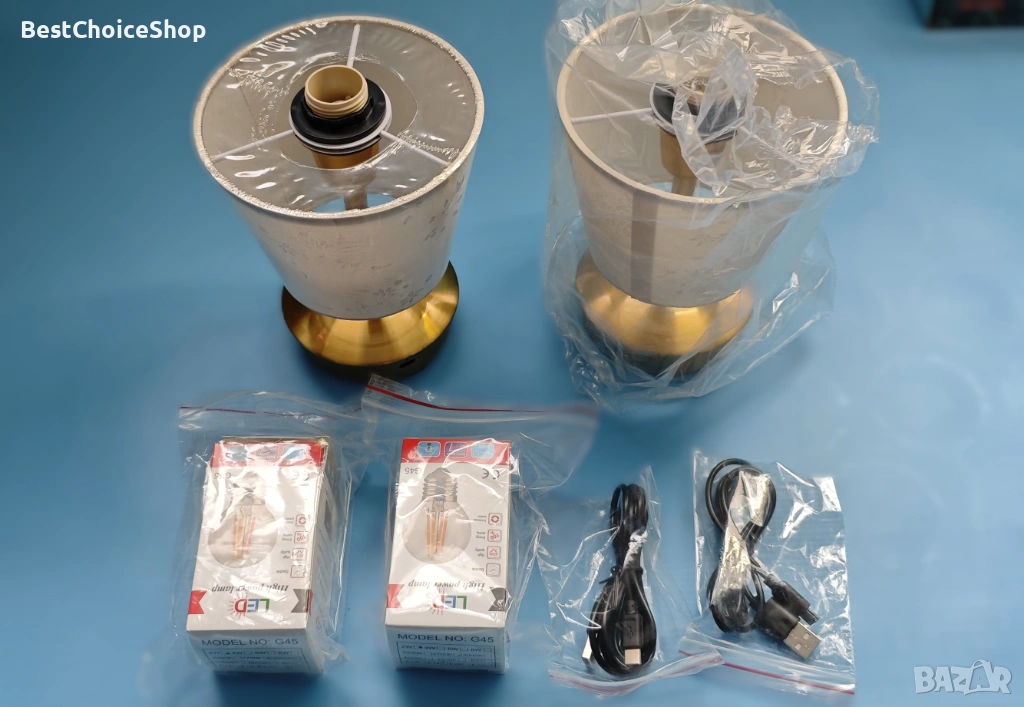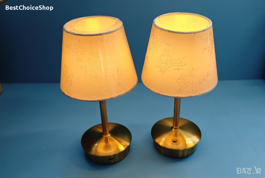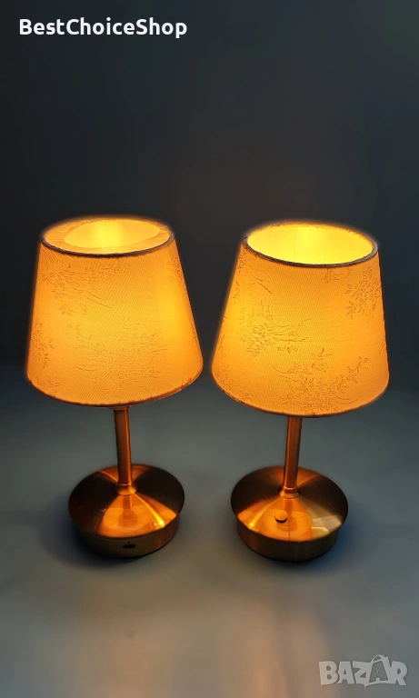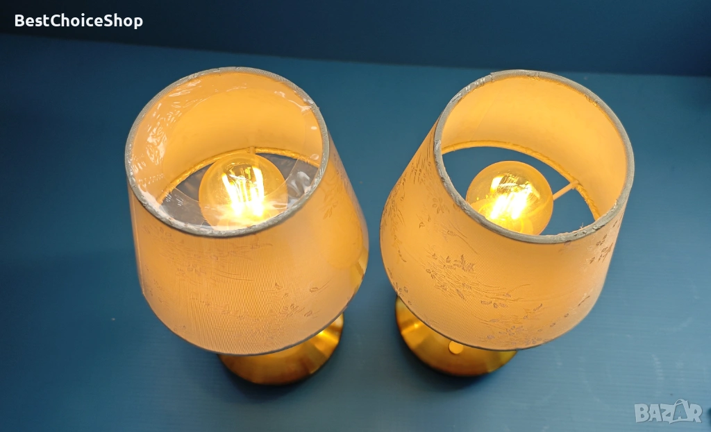 Много елегантни и стилни лампи със златиста основа и красиви текстилни абажури с нежна шарка. Перфектни за спалня, нощно шкафче, хол, бюро или като декоративно осветление.