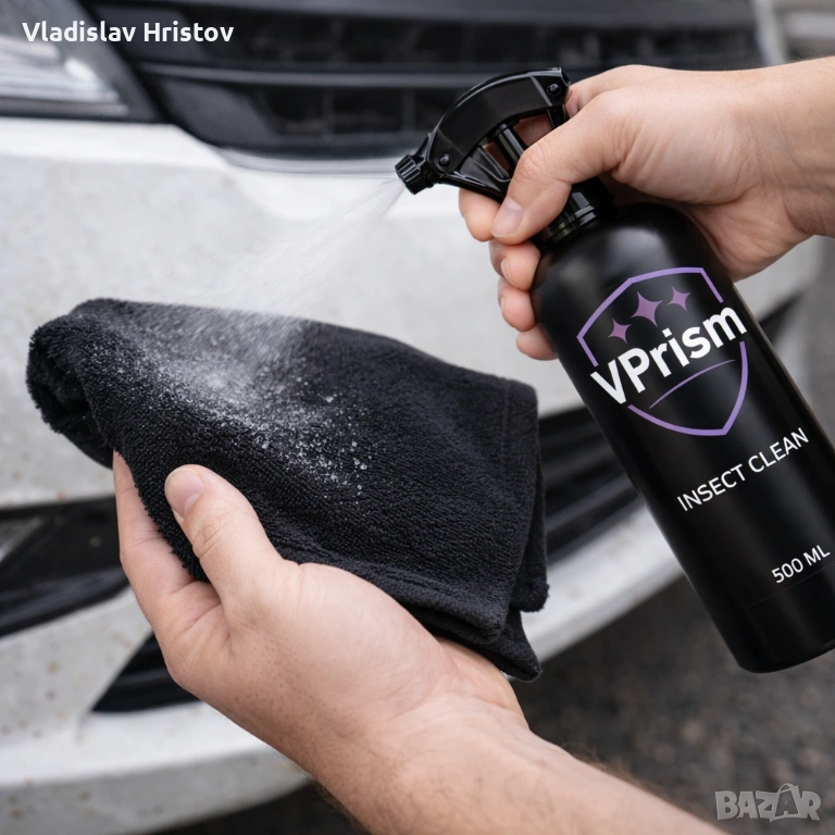 INSECT CLEAN разгражда органичните замърсявания химически — без триене, без риск за боята. Резултатът е чиста повърхност без следи.