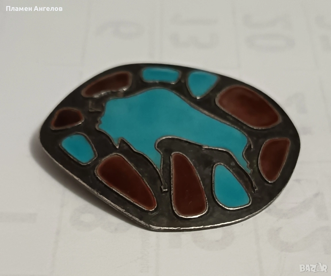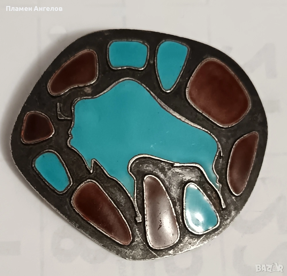 Автентична, художествена брошка със стилизирано изображение на "Зубър" произведена от Ленинград скрия ювелирен завод-ЛЮЗМ от 70те - 80те години на миналия век. Тежка по грамаж. Изработена от Мелхиор с оригинално сребърно покритие. Отлично запазена, със специфична благородна патина(потъмняване) характерна за среброто. Емайлът е непокътнат, няма пукнатини, без лющене. Предметът е не магнитен. На гърба ясно се чете клеймо то ЛЮЗМ-гарантиращо произхода от престижния завод за имайлиран изделия в СССР. Това не е масова алуминиева значка. Това е масивно бижутерско изделие с колекционерска стойност. Диаметър към 5см.