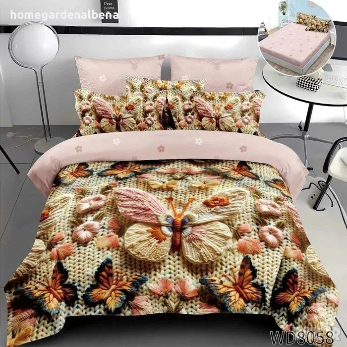 Ключови думи: спален комплект, чаршаф с ластик, плик за завивка, калъфки, 100% памук, флорален, пеперуди, сърца, детски десен, двоен комплект, спалня, домашен текстил, подарък