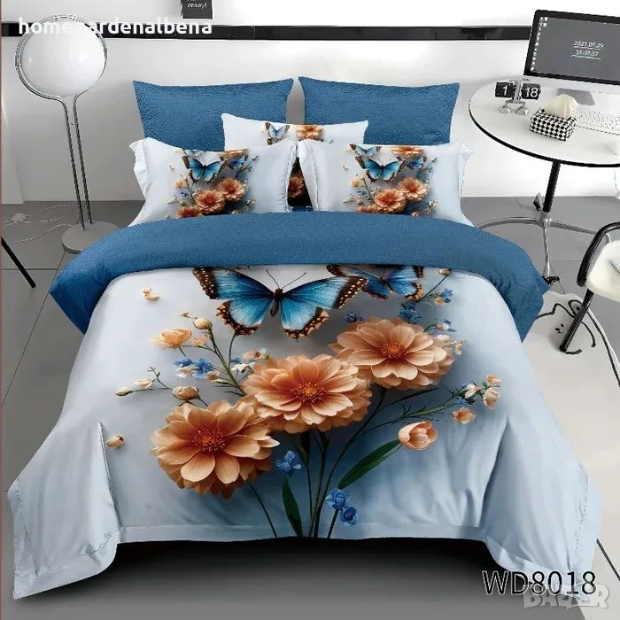 Ключови думи: спален комплект, чаршаф с ластик, плик за завивка, калъфки, 100% памук, флорален, пеперуди, сърца, детски десен, двоен комплект, спалня, домашен текстил, подарък