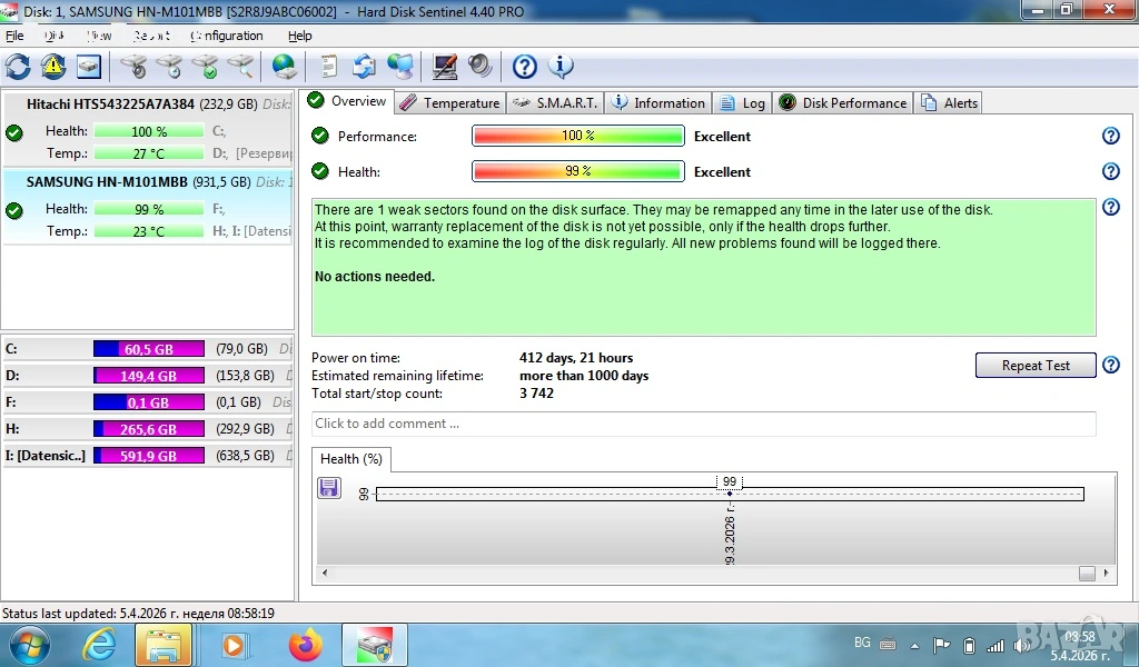 Диска работи, но е на 99% здраве. Дефекта е пренебрежимо малък и мисля че няма да пречи за нормално ползване на харда.