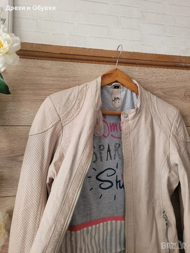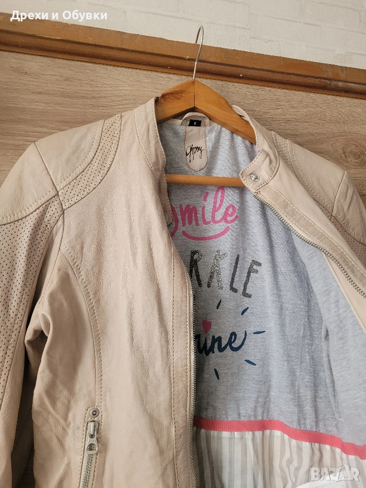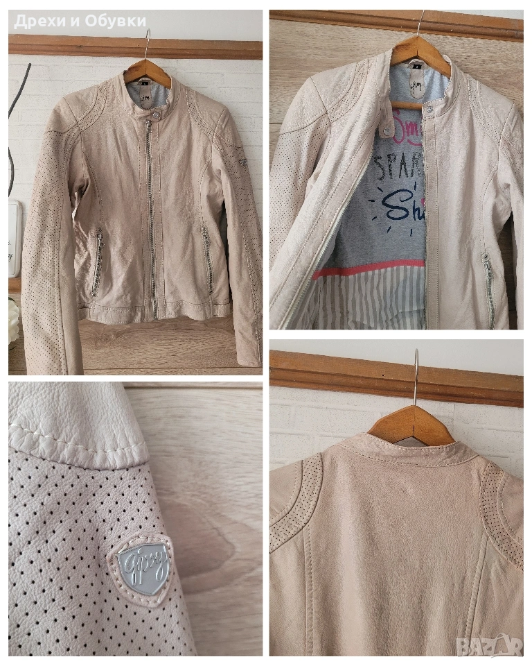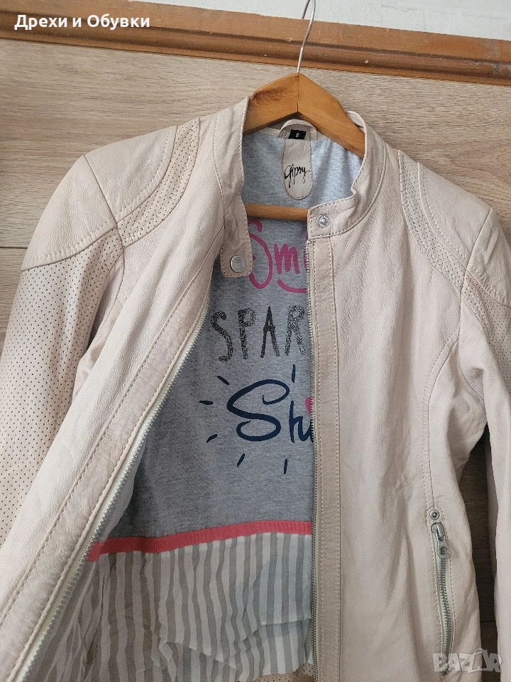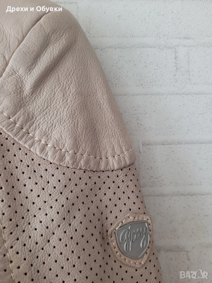 Стилно дамско яке от естествена кожа в нежен бежов цвят на немската марка GIPSY. Моделът е изключително удобен и модерен, с изчистена визия и ефектни перфорирани детайли по ръкавите и раменете. Закопчава се с цип, има два странични джоба с ципове и къса, вталена кройка, която подчертава силуета. Якето е меко и приятно на допир, подходящо за пролет и есен. Много красива памучна материя с принт. Лесно се комбинира както с дънки и тениска, така и с по-елегантни визии. Размер: S ( подходящо о за М) Гръдна 92см, дължина 56см. Перфектен избор за стилна и практична визия! Още снимки в коментар. Цена 65€