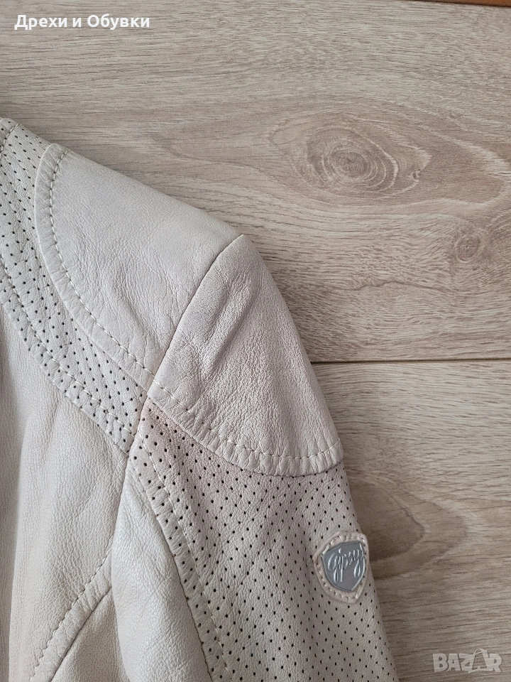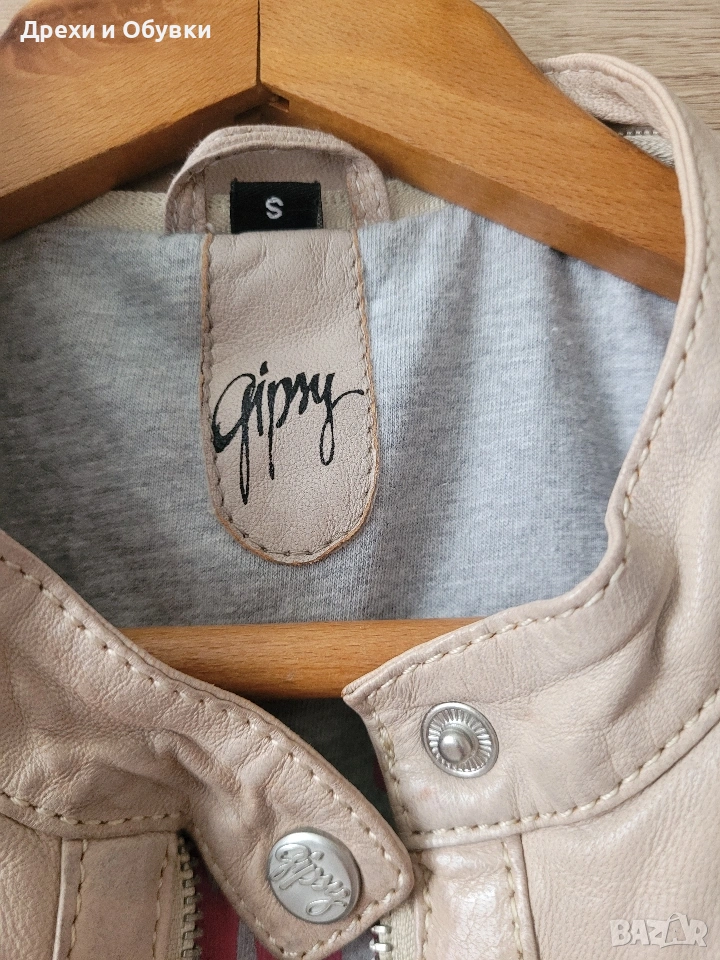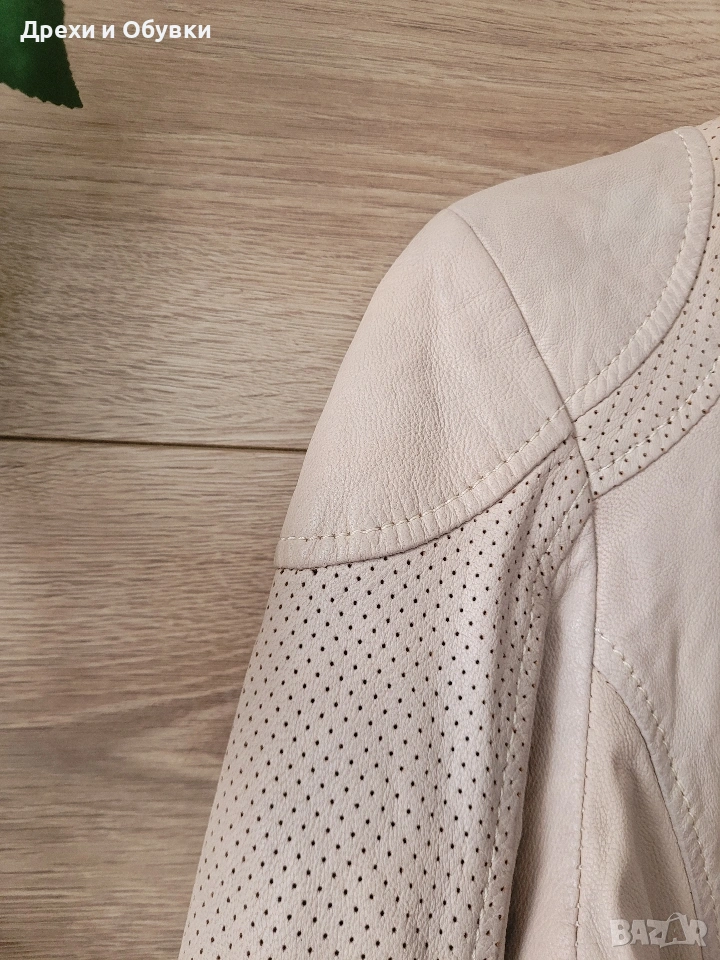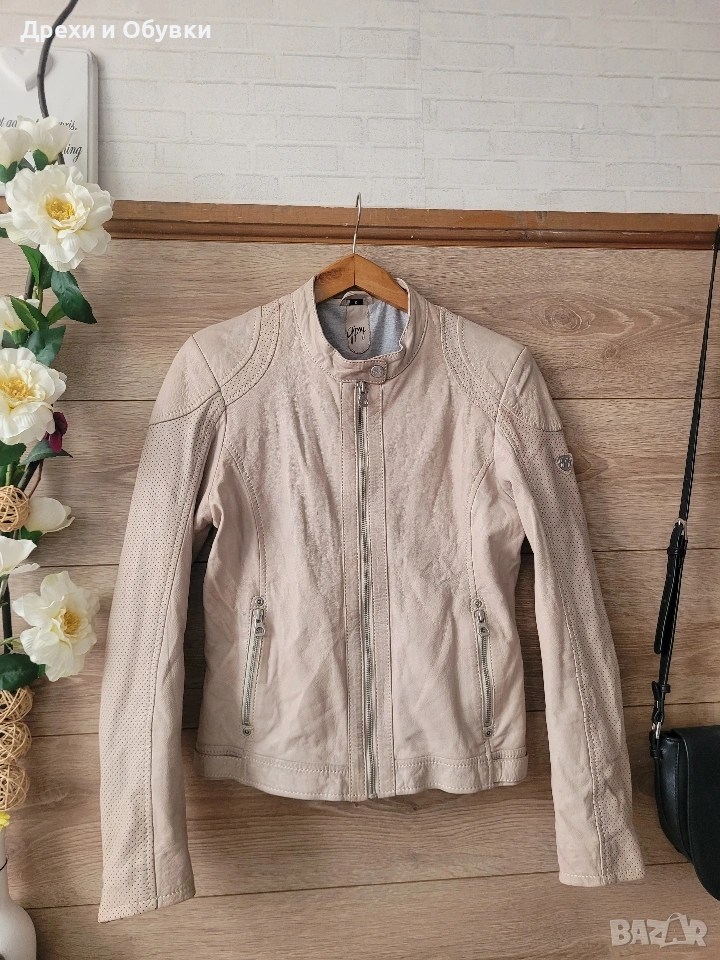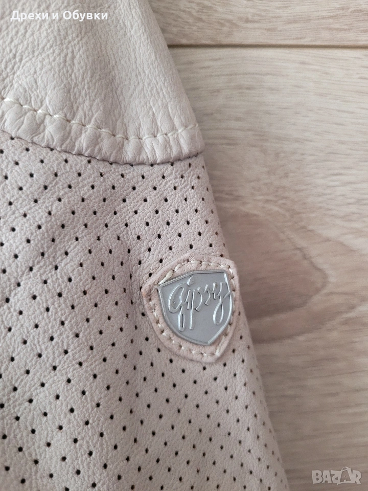 Стилно дамско яке от естествена кожа в нежен бежов цвят на немската марка GIPSY. Моделът е изключително удобен и модерен, с изчистена визия и ефектни перфорирани детайли по ръкавите и раменете. Закопчава се с цип, има два странични джоба с ципове и къса, вталена кройка, която подчертава силуета. Якето е меко и приятно на допир, подходящо за пролет и есен. Много красива памучна материя с принт. Лесно се комбинира както с дънки и тениска, така и с по-елегантни визии. Размер: S ( подходящо о за М) Гръдна 92см, дължина 56см. Перфектен избор за стилна и практична визия! Още снимки в коментар. Цена 65€
