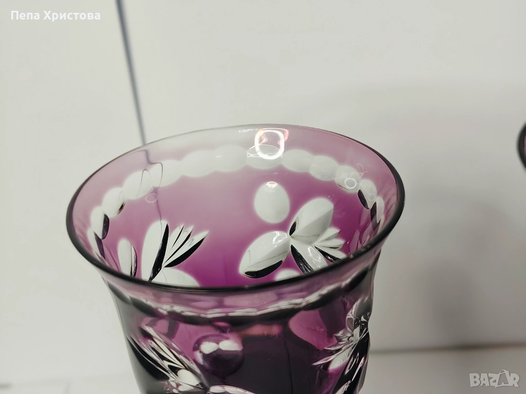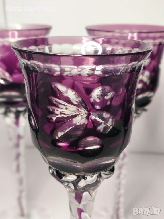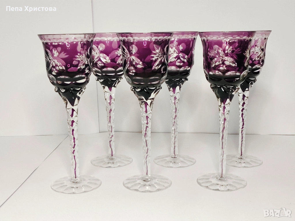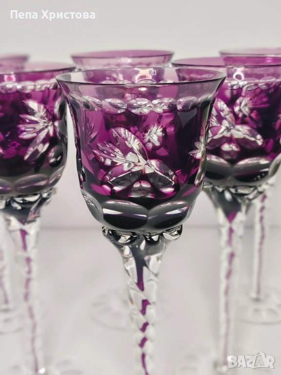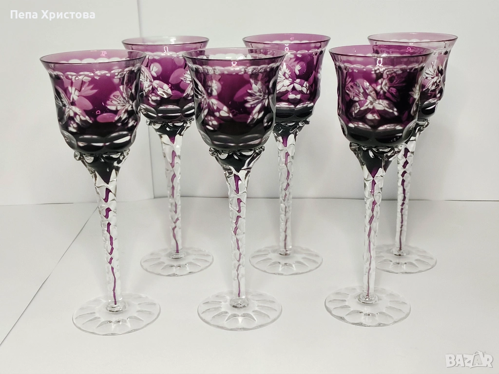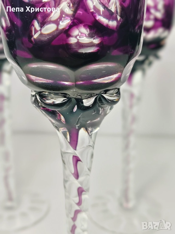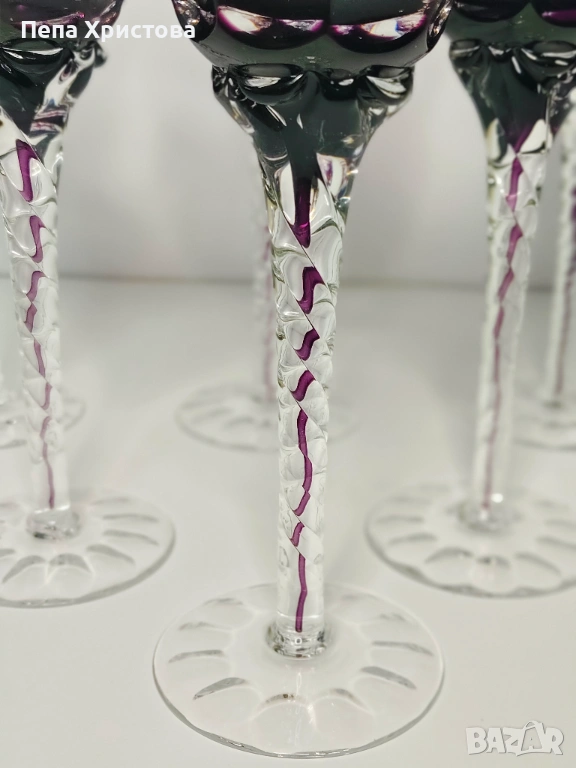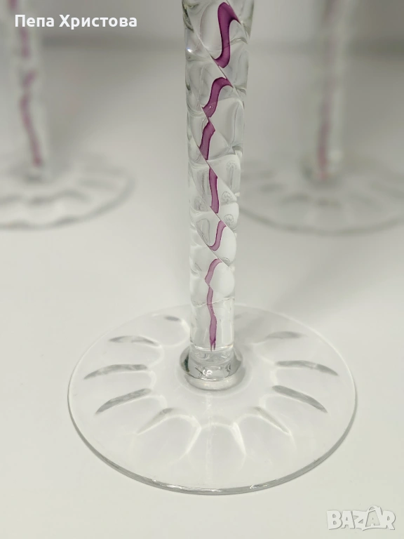 Комплект от 6 броя чаши за вино от оловен цветен кристал с цвят на аметист и цветна спираловидна жила до основата на столчето.