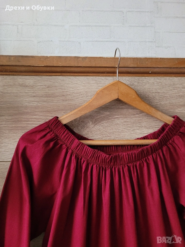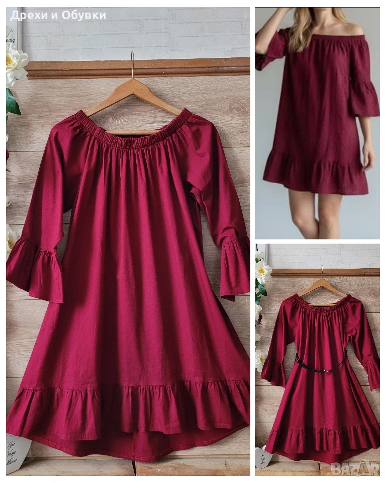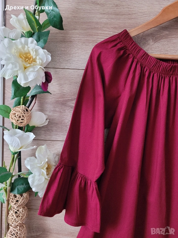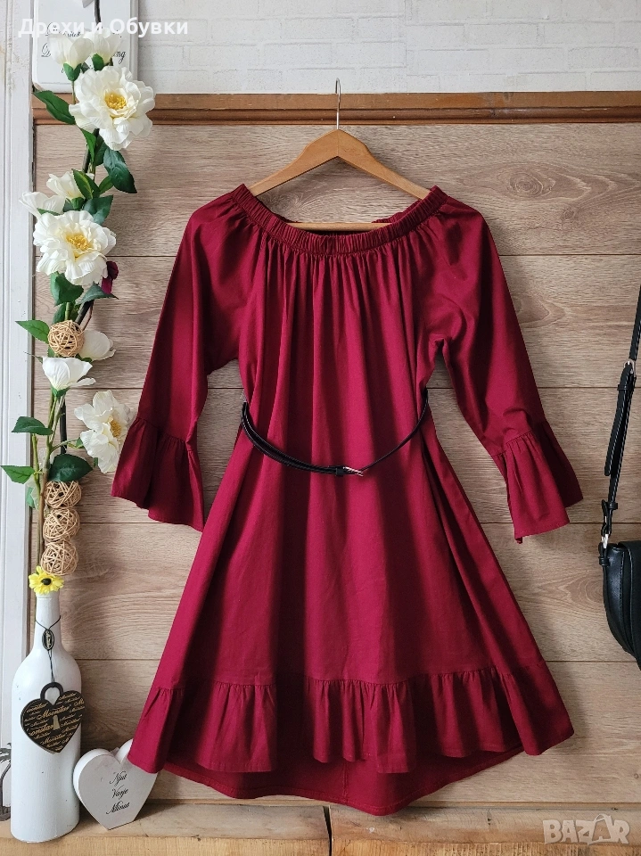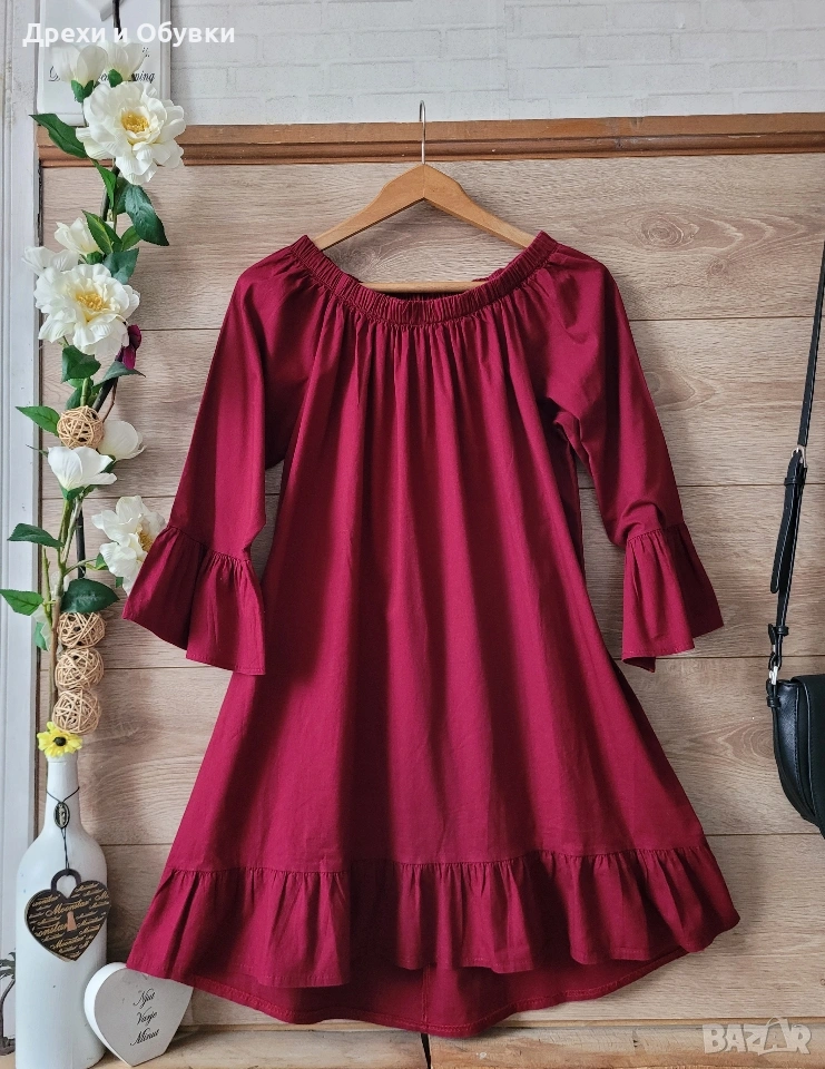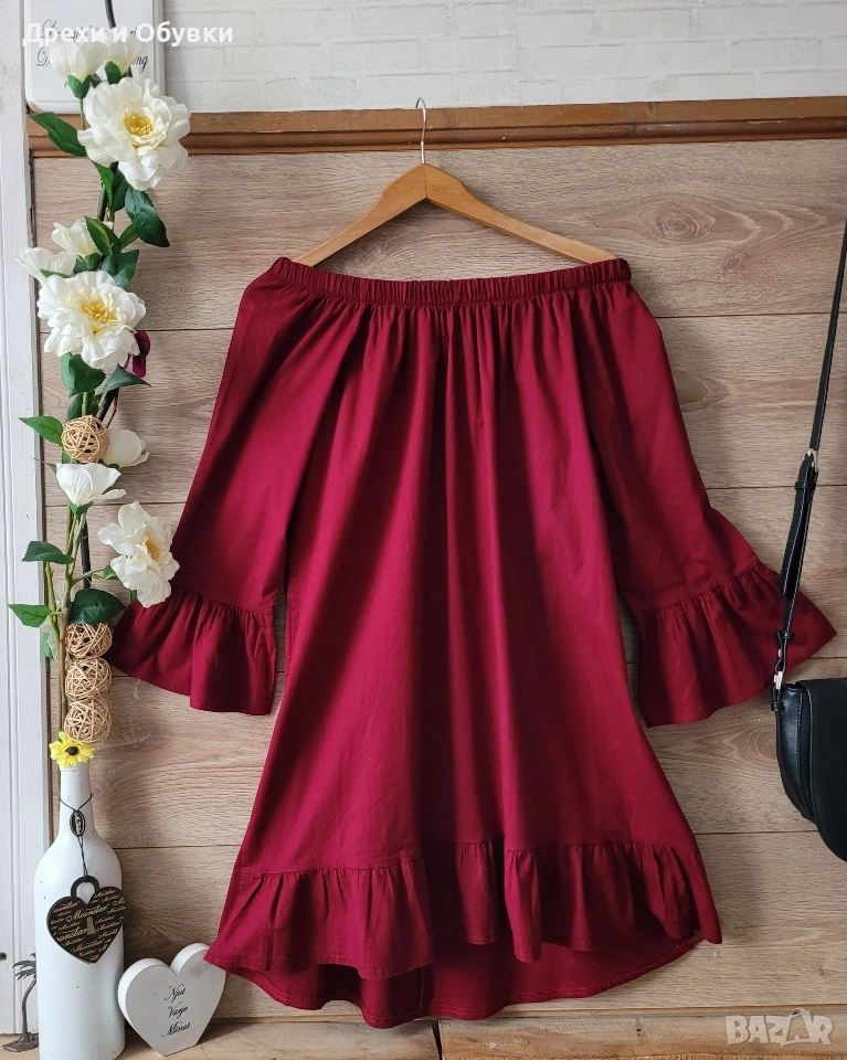 Стилна разкроена рокля/туника в наситен бордо цвят made in Italy – перфектен избор за елегантна и женствена визия. Моделът е с ластик около деколтето, което позволява да се носи както класически, така и със свободно паднали рамене за по-секси и небрежен стил. Леката и ефирна кройка осигурява комфорт и свобода на движение, като същевременно прикрива и оформя красиво силуета. Подходяща е както за ежедневието, така и за специални поводи – лесно се комбинира с обувки на ток или кецове/ сандали с по-ежедневни аксесоари. Размер S/M Дължина 80см , гръдна до 100см ( носи се свободно). Цена 20€