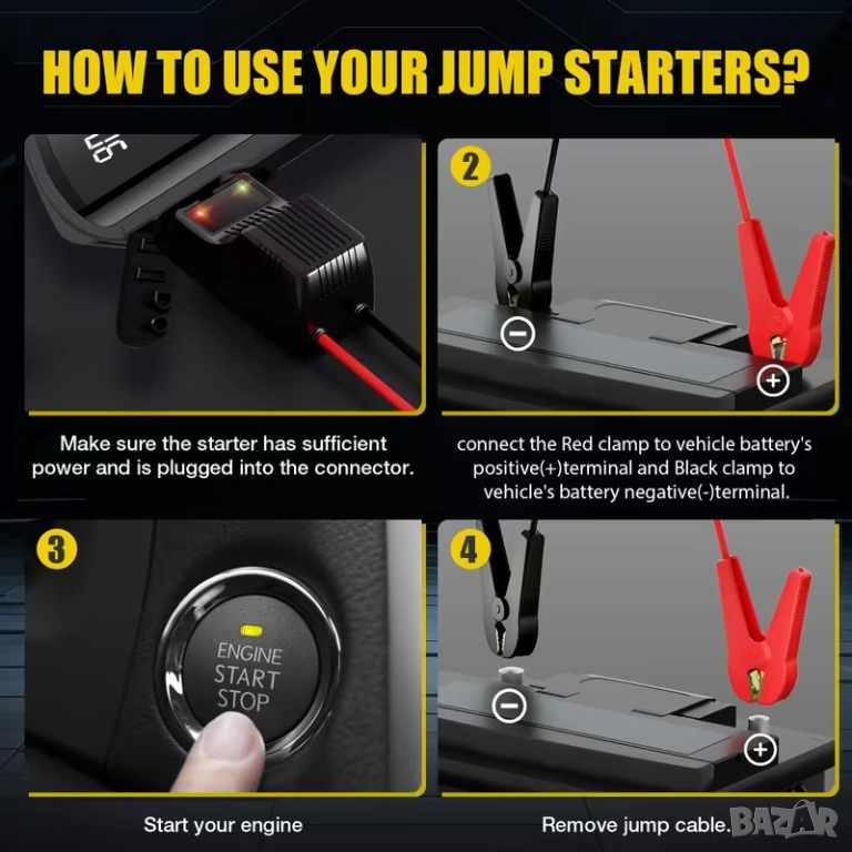 Забележка: За да има успех операцията по стартиране, уверете се предварително, че има достатъчно енергия, съхранена в батерията! Проверявайте редовно нивото на заряд и при необходимост дозареждайте, за да бъде устройството винаги в пълна готовност.