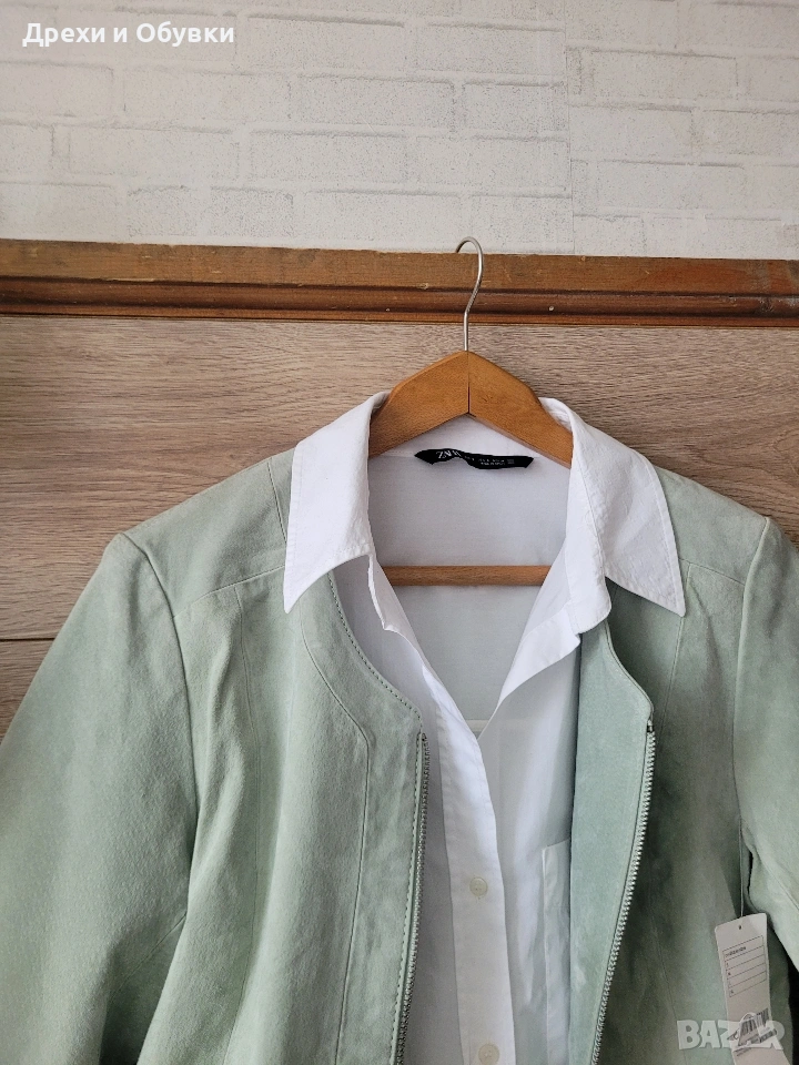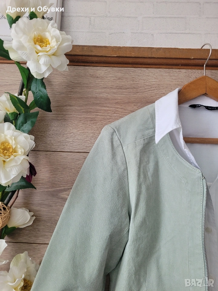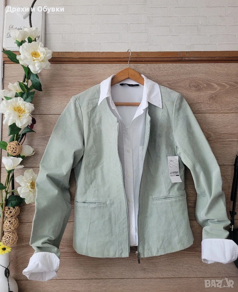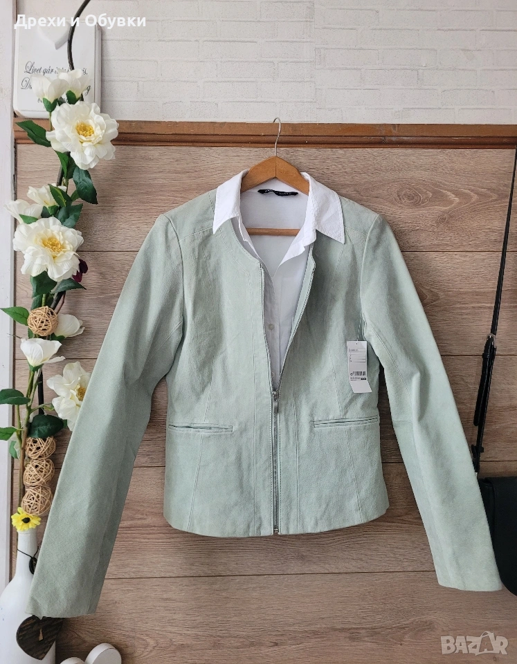Стилно дамско яке в цвят мента от естествена кожа на марката Hema. Якето е чисто ново с етикет, не е носено. Моделът е къс, с изчистен дизайн и цип отпред, без яка – много елегантно и подходящо както за ежедневие, така и за по-официални визии. Цветът е модерен пастелен нюанс, който е много актуален и лесен за комбиниране с риза, дънки рокля , блузка. Както за ежедневна така и за елегантна визия. ✔️ Материя: естествена кожа ✔️ Състояние: ново с етикет ✔️ Цвят: мента ✔️ Закопчаване: цип ✔️ Джобове: два странични Размер М Цена 55€