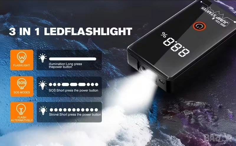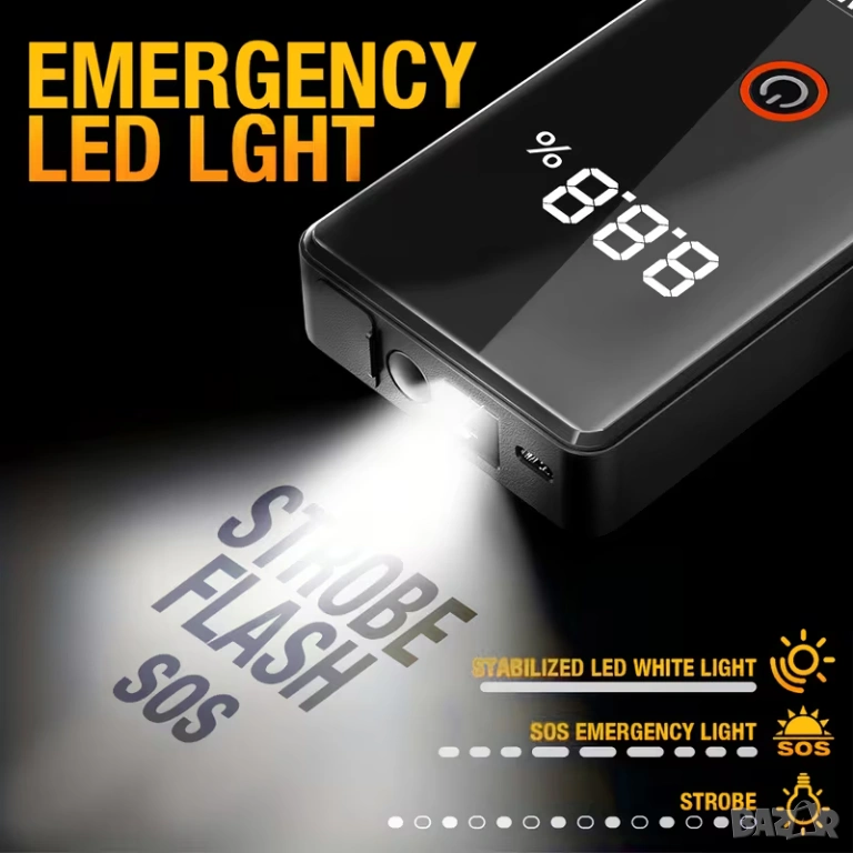 С акумулаторна литиево-полимерна батерия, дисплей, LED фенерче с три режима на светене и функция ”POWER BANK” за зареждане на мобилни устройства и др..
