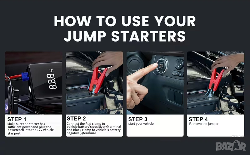 Характерно за устройството е, че стартерните щипки нямат защита от късо съединение, обратно свързване и претоварване. Изисква се внимание при свързването на положителните и отрицателните клеми. Неправилно свързване може да доведе дори до запалване!!! Червената щипка се свързва към положителния терминал на автомобилния акумулатор, а черната щипка - към отрицателния терминал.