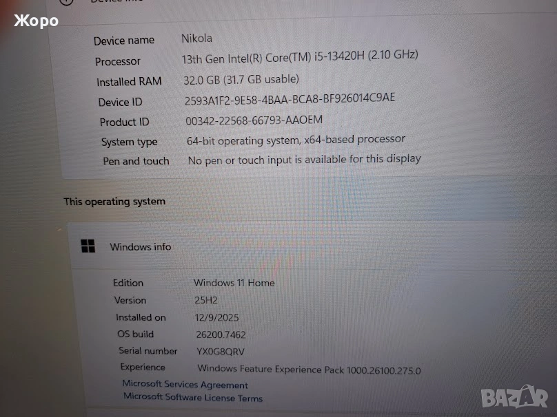 13 th Gen Intel i5 ; RAM 32 Gb ; HDD 1 Tb.