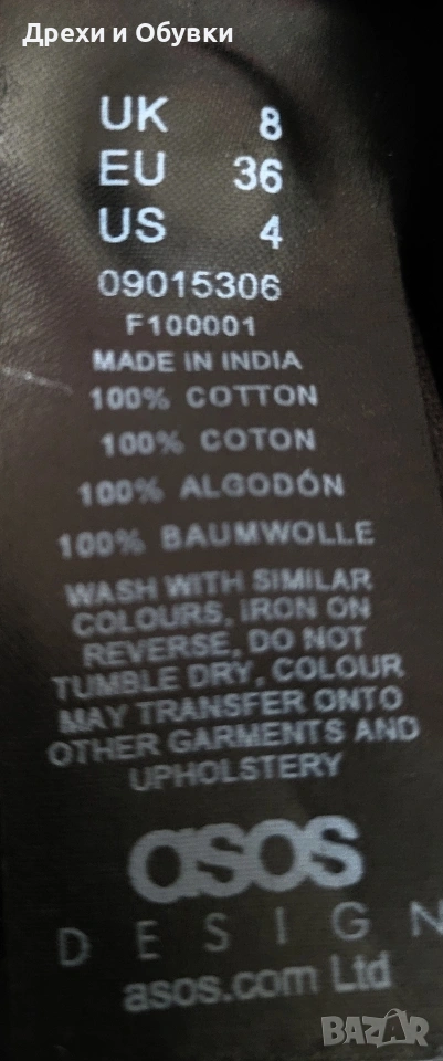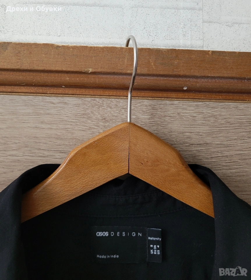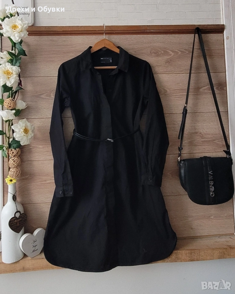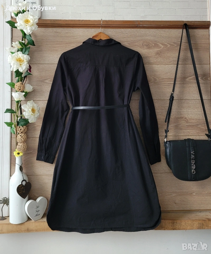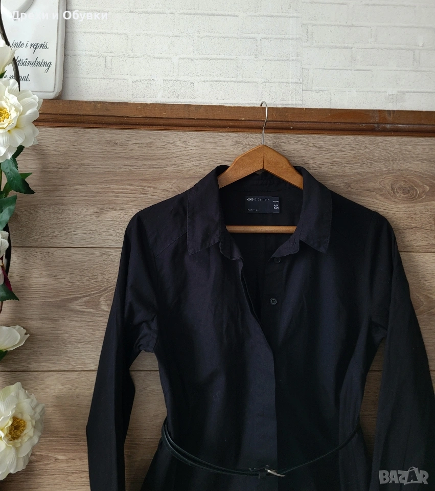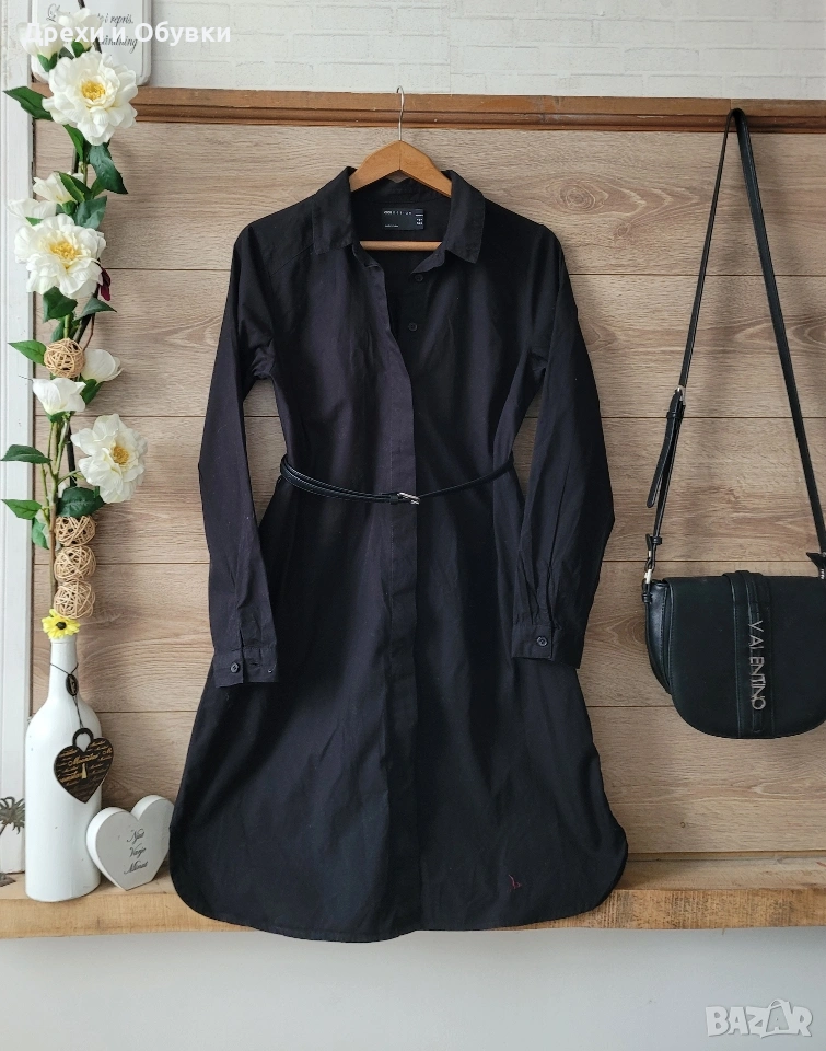 Стилна черна рокля тип риза от ASOS. Изработена от 100% памучна материя. Моделът съчетава комфорт и елегантност, с класическа яка и закопчаване по цялата дължина. Роклята е универсална и подходяща както за ежедневието, така и за по-небрежни официални поводи. Може да се носи както самостоятелно, така и в комбинация с колан за подчертаване на талията. Размер по етикет S , подходяща и за М. Дълга 91см, гръдна 96см Отлично състояние Цена 22€