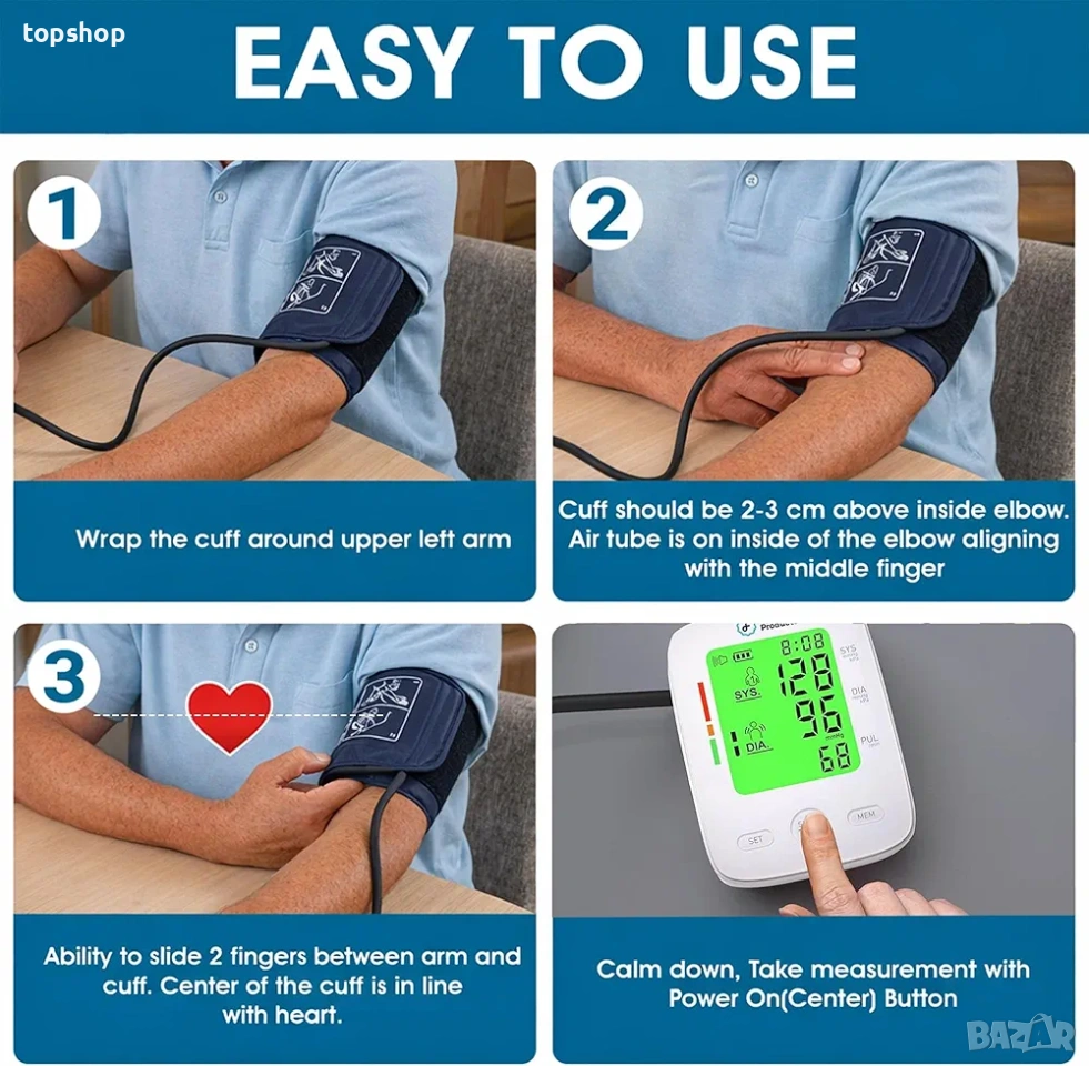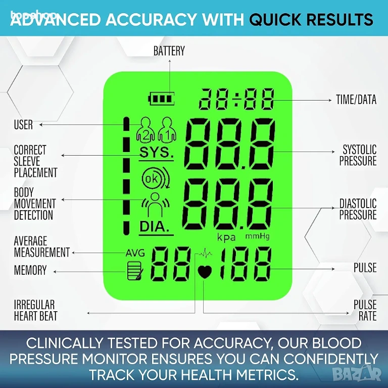 Голям и ясен LCD екран показващ систолно диастолно налягане и пулс