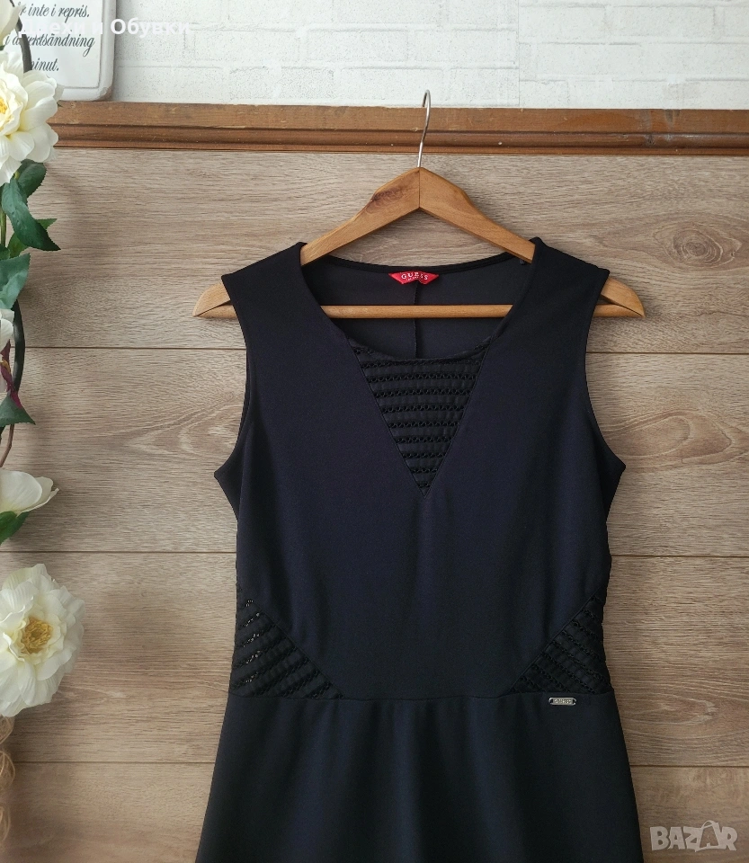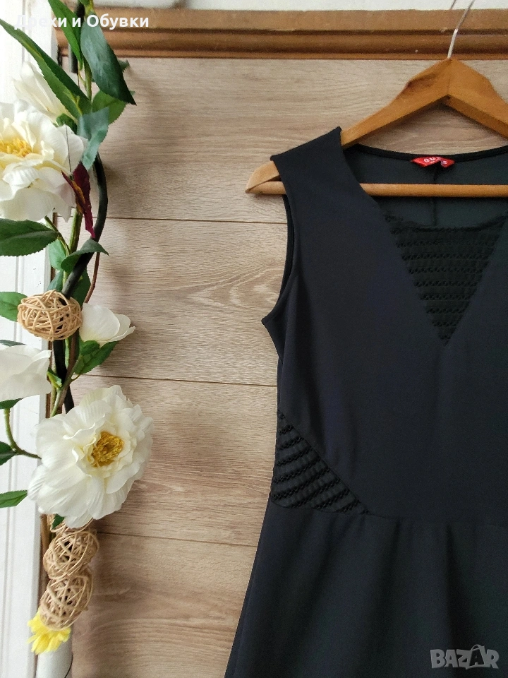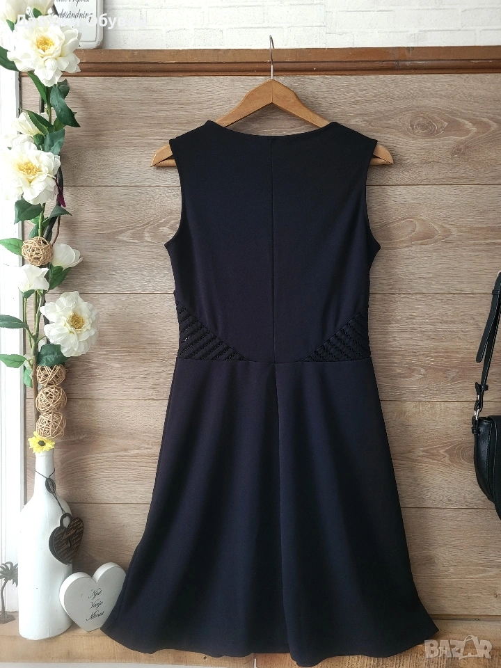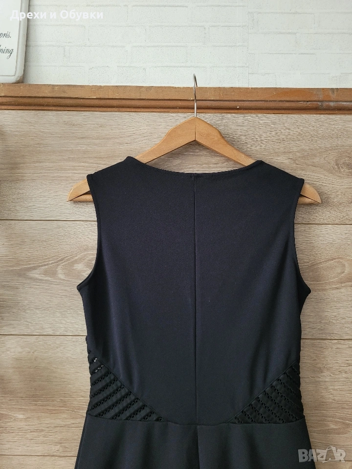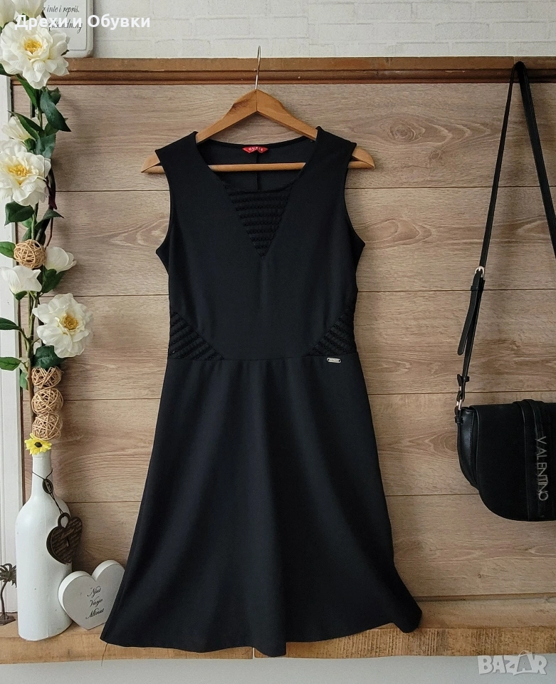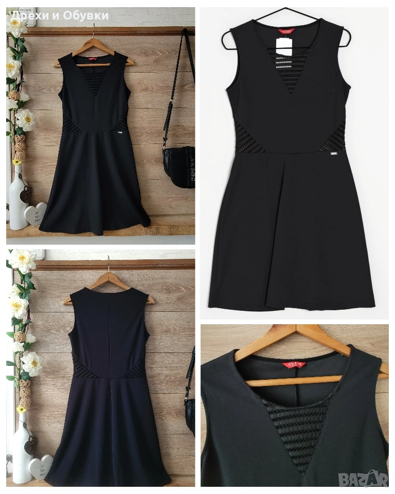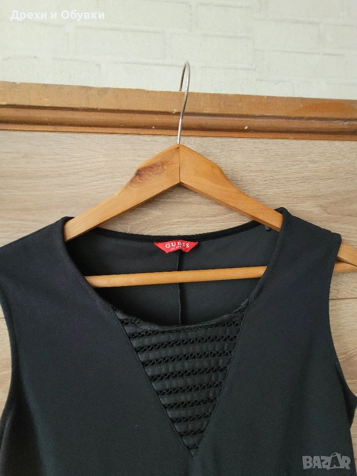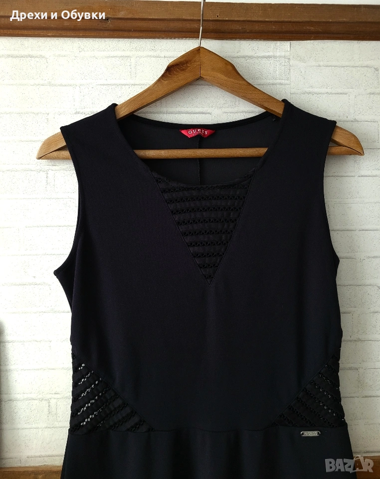 Елегантна черна рокля от GUESS. Разкроена кройка, подчертаваща женствената силуетна линия. Моделът е с изискани мрежести детайли около деколтето и талията, които придават стилен акцент. Роклята е подходяща както за специални поводи, така и за вечерни излизания. Комбинира се лесно с високи токчета и минималистични аксесоари за завършена визия. Метално лого на марката . Размер S с еластичност на цялата материя. Дълга 89см Гръдна 88-96см ( силно еластична) Като нова. Цена 49€