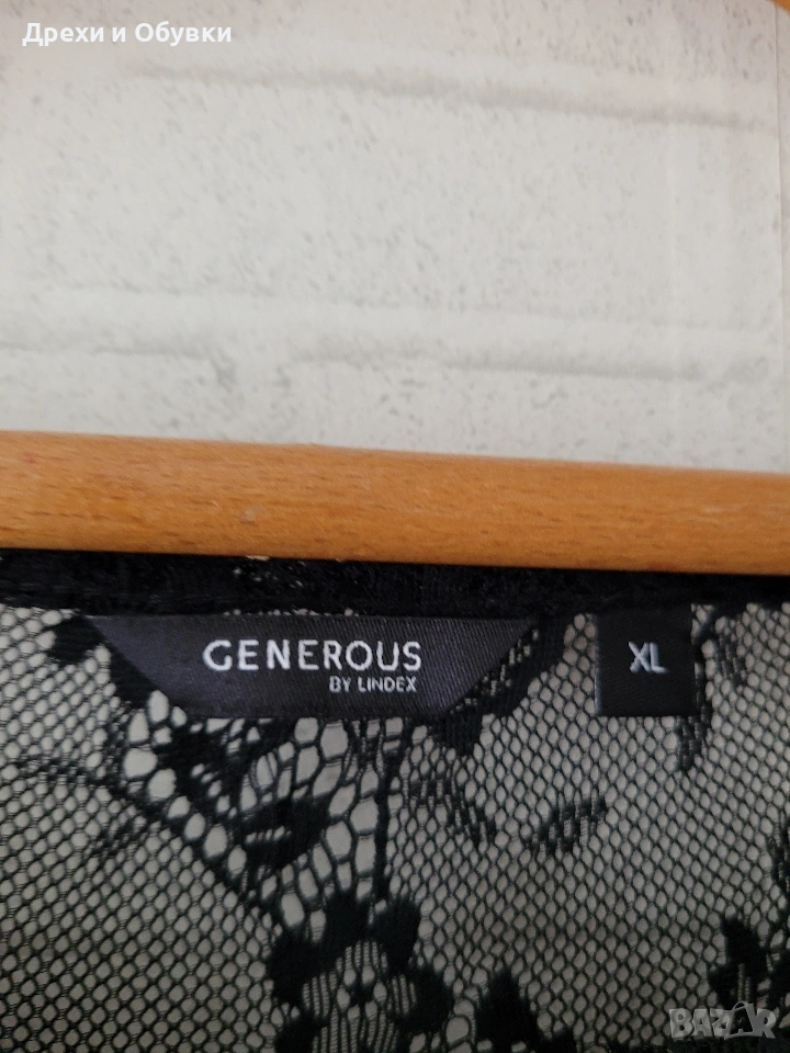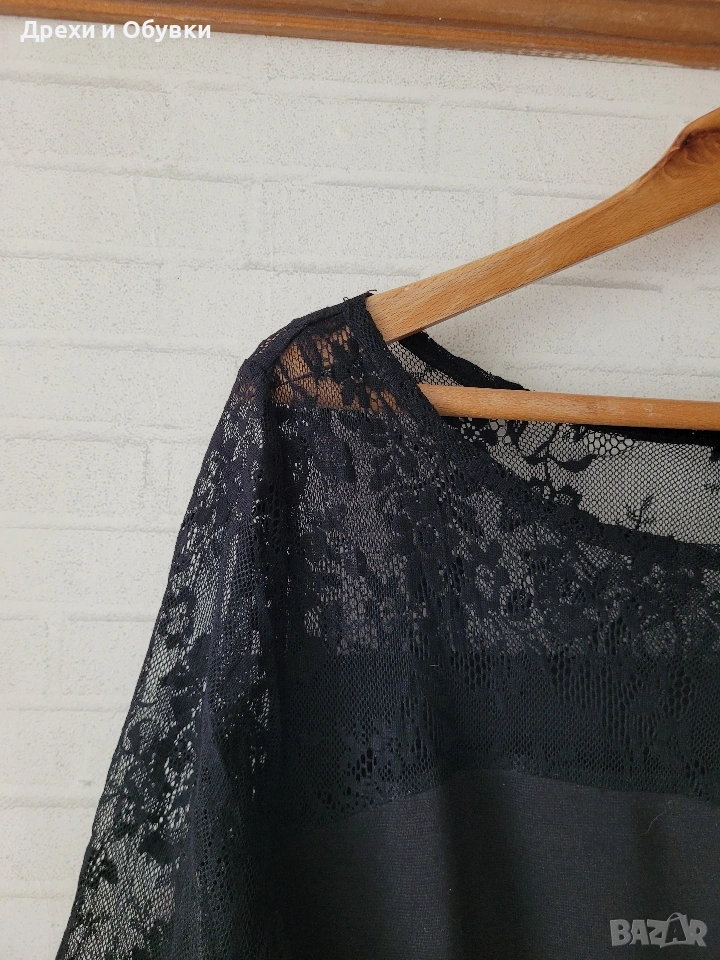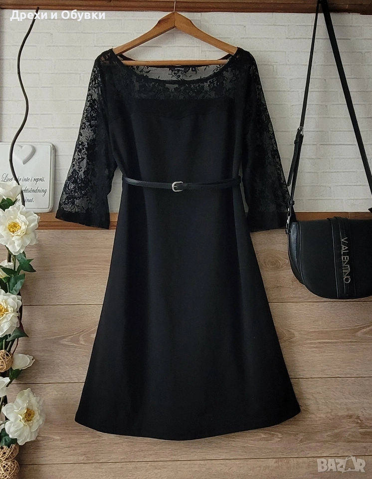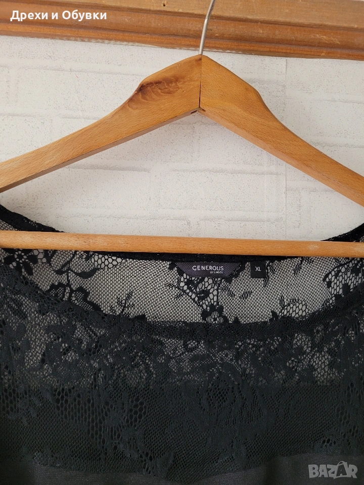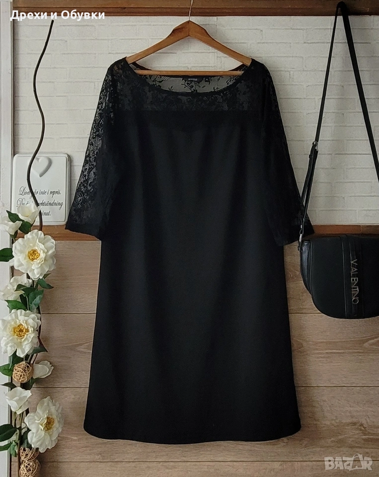 Елегантна черна рокля GENEROUS Еластична материя, която подчертава силуета и осигурява комфорт през целия ден. Моделът е с фини дантела над деколтето и 3/4 ръкави, придаващи нежност и женственост на визията. ✔ Мека и еластична материя ✔ Дантелени 3/4 ръкави за изискан акцент ✔ Класически черен цвят – винаги актуален ✔ Подходяща за официални поводи, работа или вечерни излизания Стилна и универсална рокля, която не бива да липсва в гардероба Размер ХЛ Дълга 97см, гръдна 110см ( материята има цялостна еластичност). Цена 17€