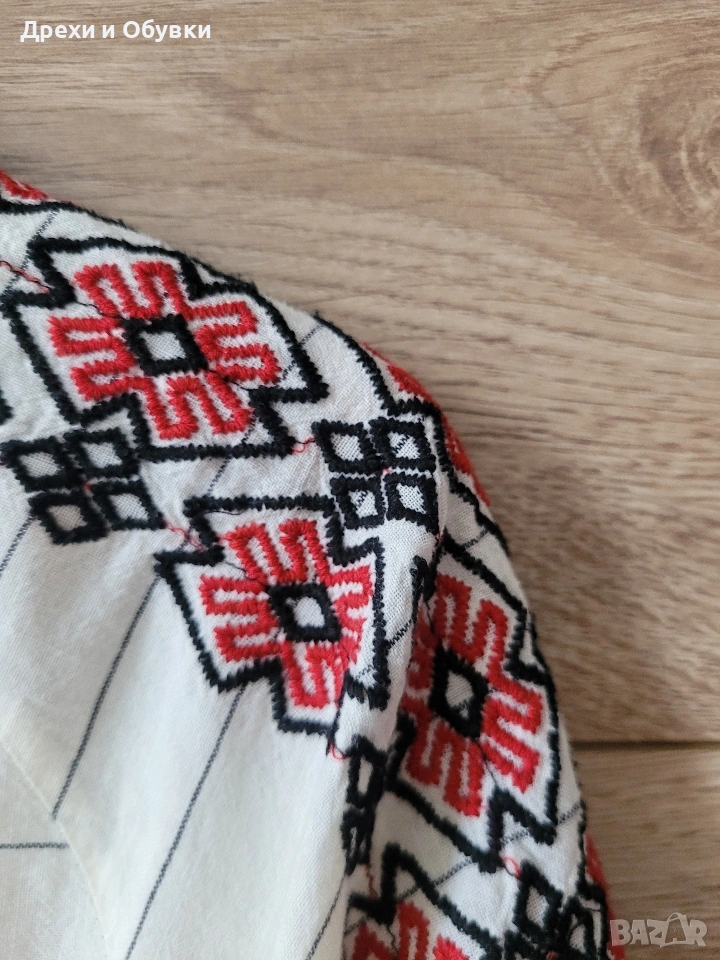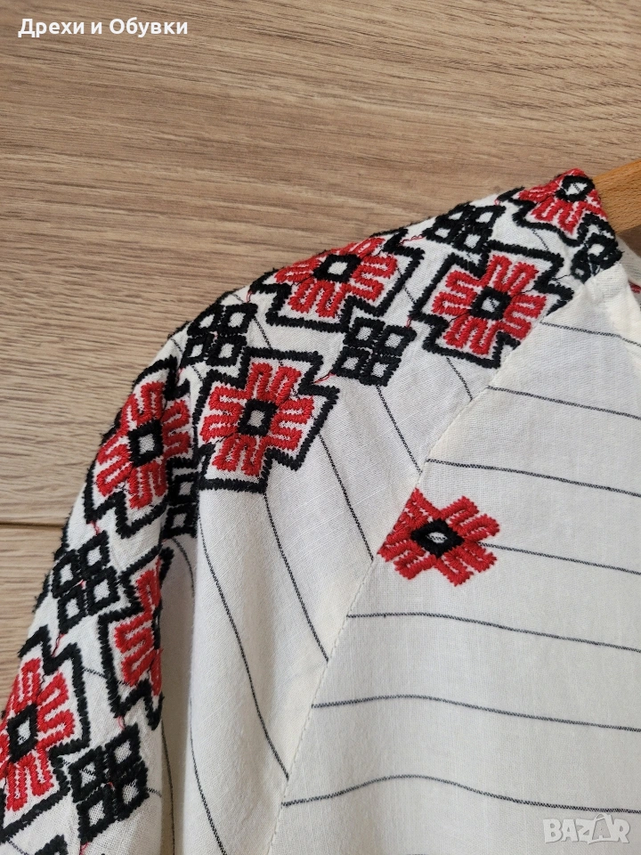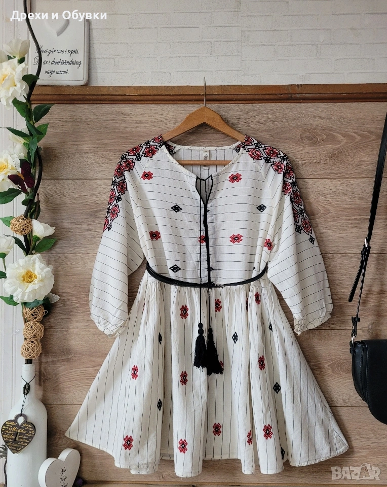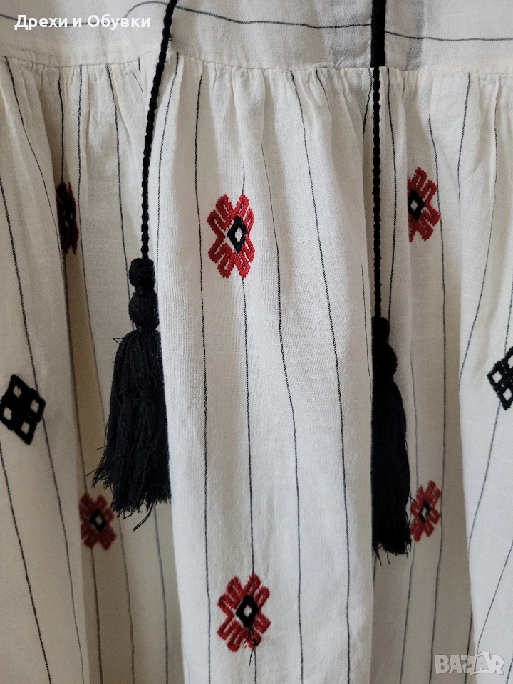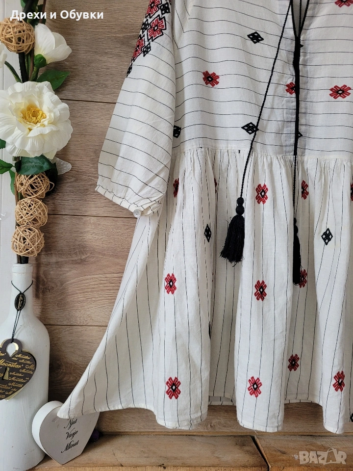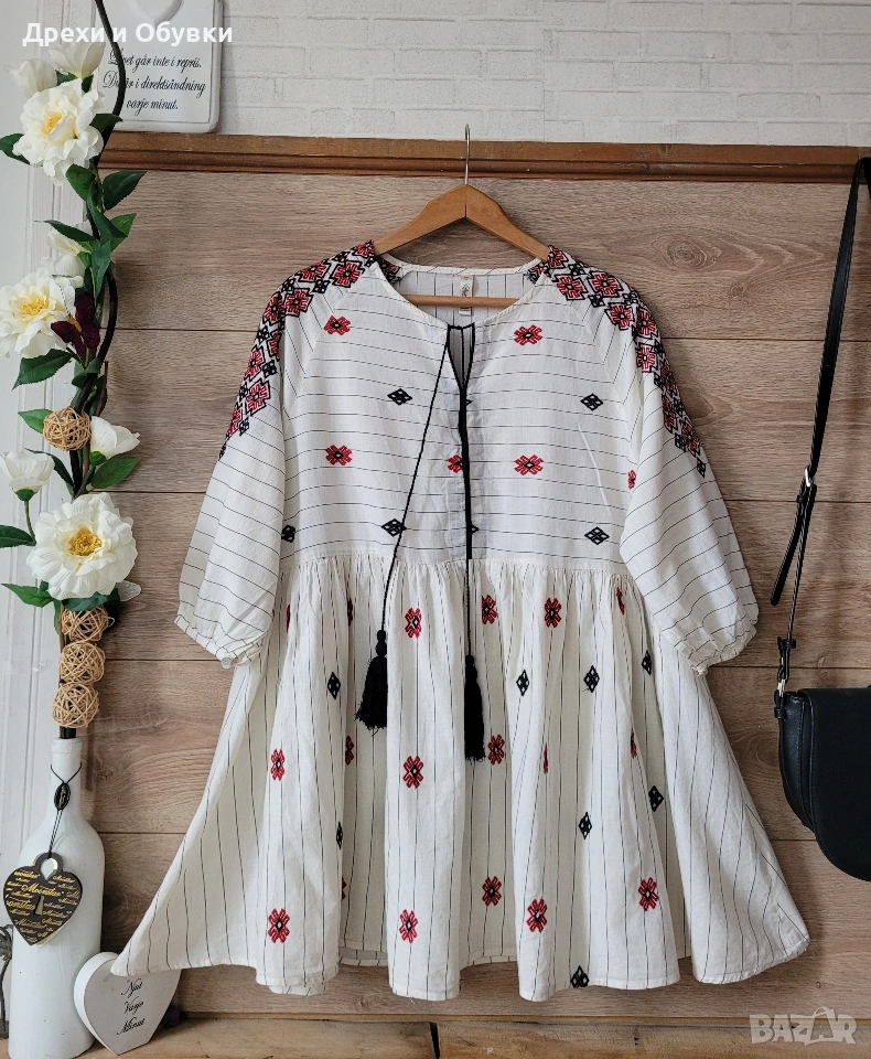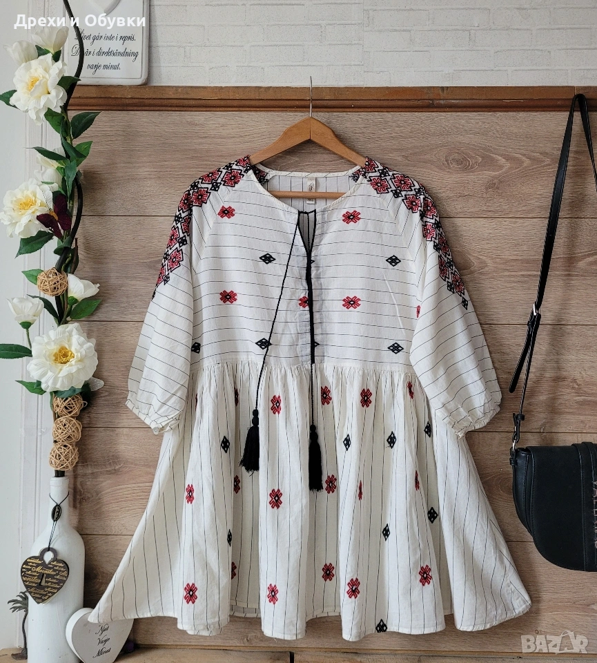 Нежна туника или рокля с бродерия шевици в бохо стил ETHNIC. Красива и ефирна в светъл цвят с фина бродерия в червено и черно. Свободната кройка и леката материя я правят изключително удобна и подходяща за ежедневие, разходки или летни събития. ✨ Детайли: • Декоративна бродерия по раменете и по цялата дължина. • Връзки с пискюли в предната част • Ръкави със закопчаване копчета. • Свободна, разкроена кройка • Лека и приятна 100% памучна материя Размер: Л Дължина 80см, гръдна до 108см Състояние: отлично Лесно се комбинира със сандали, ботуши или лятна чанта. Цена 30€