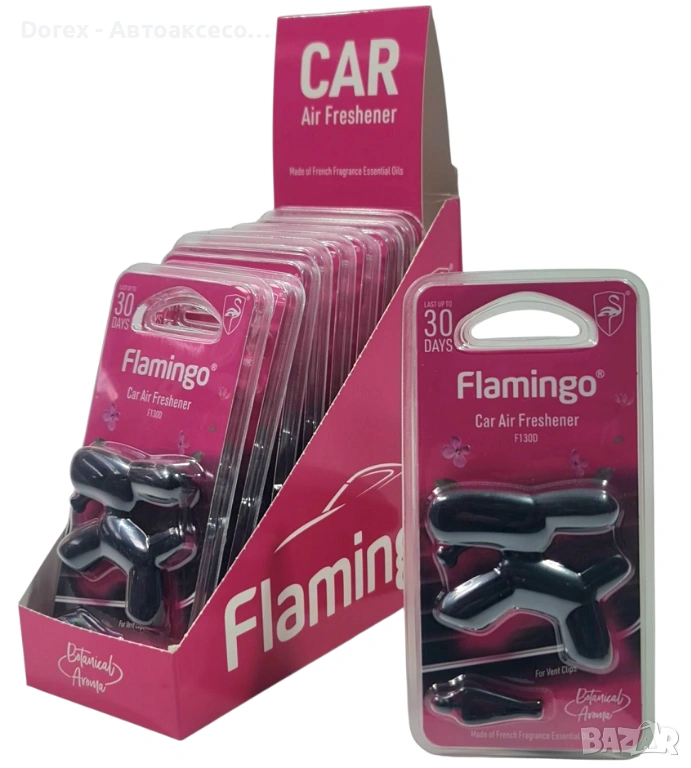 Ароматизатор за автомобил „Flamingo“ F130D с модерен дизайн, предназначен за поставяне на вентилационната решетка. Осигурява дълготраен свеж аромат до 30 дни, изработен с френски ароматни масла. Компактен, лесен за монтаж и подходящ за всеки автомобил.