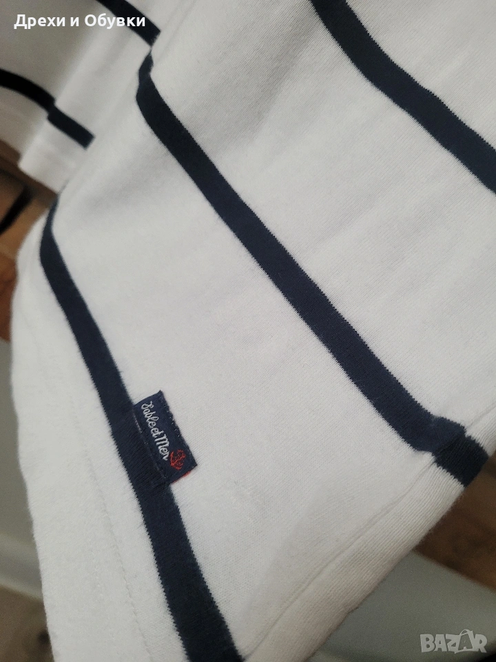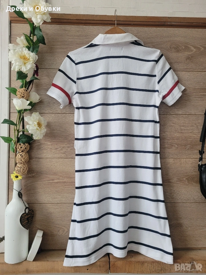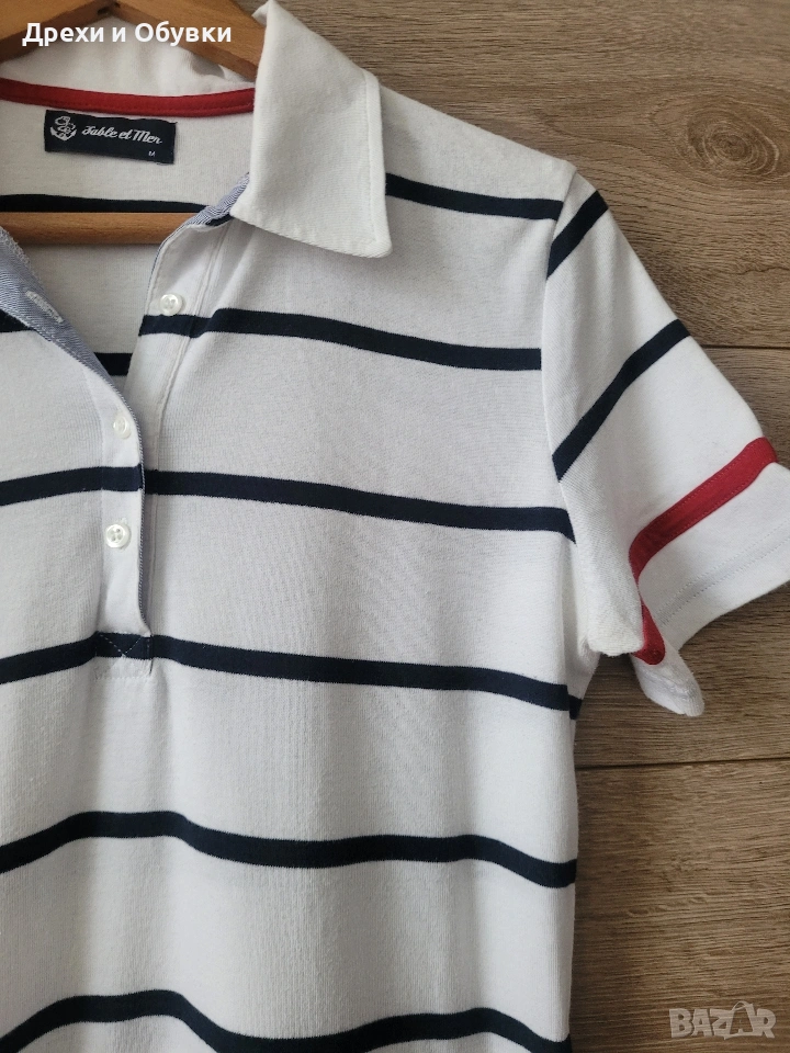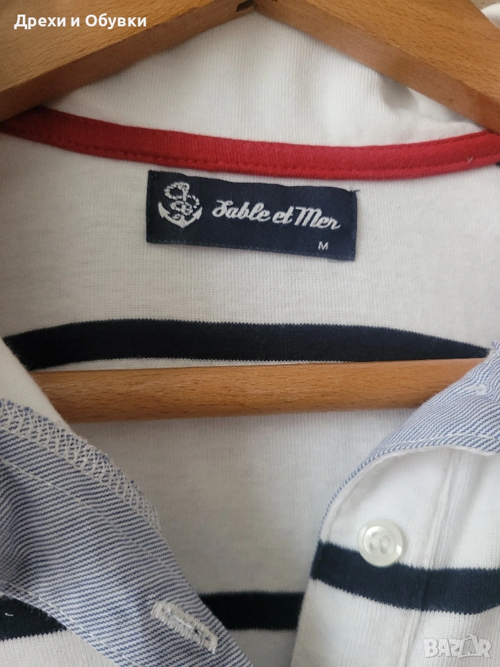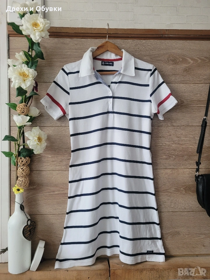 Спортно елегантна рокля рип тениска Sable et Mer. Мекичка еластична материя. Якипка с копчета. Деен: бяло, тъмно синьо райе със завършек червен кант . Пришито лого я долния ляв ъгъл. За ежедневието с кецове или сандали. Стои страхотно! Размер М. Цена 21€