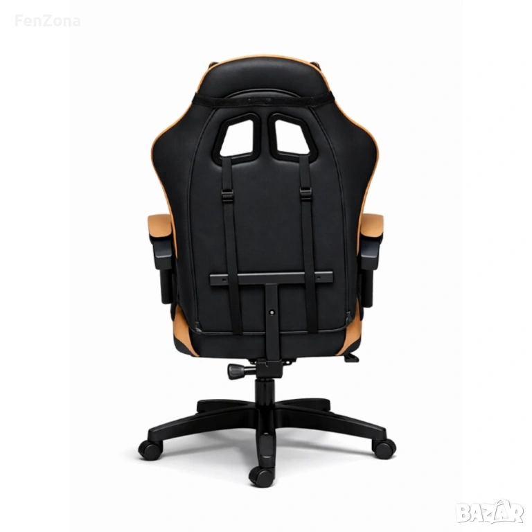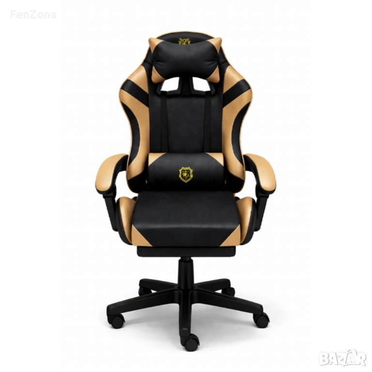 Геймърски стол с масажна функция, лумбална възглавница и поставка за крака – Черен-златист
