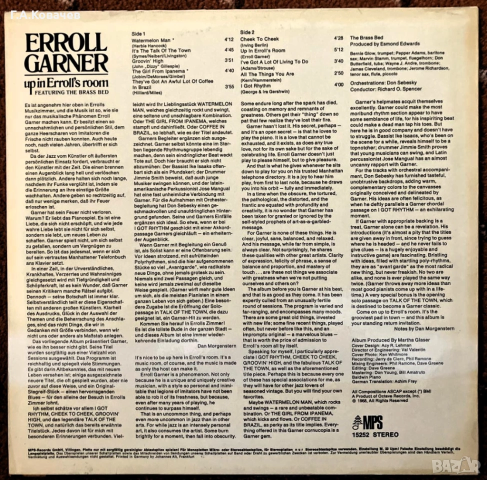 Грамофонна плоча ERROLL GARNER up in Erroll's room 1968 → Обява 54096947