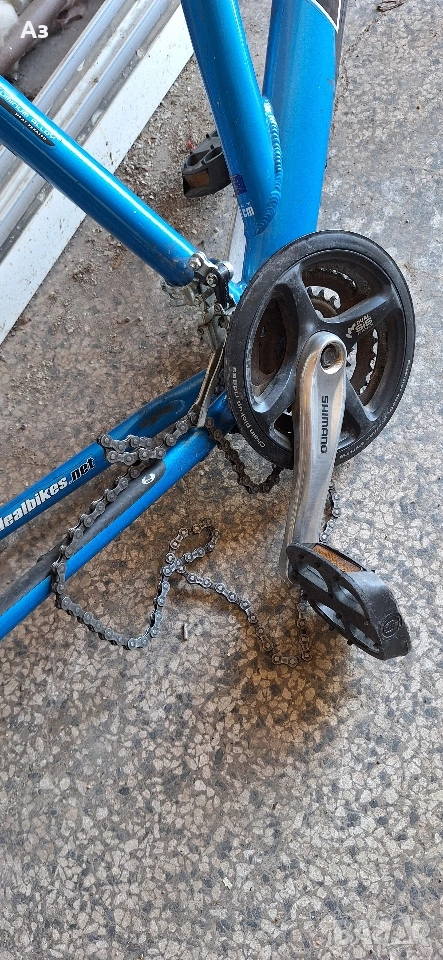 Здрава алуминиева рамка със вилка работеща много добре и педали, верига и автомат както е на снимките