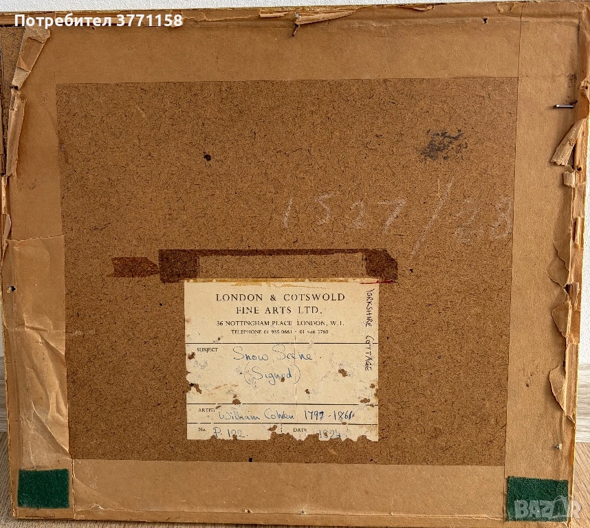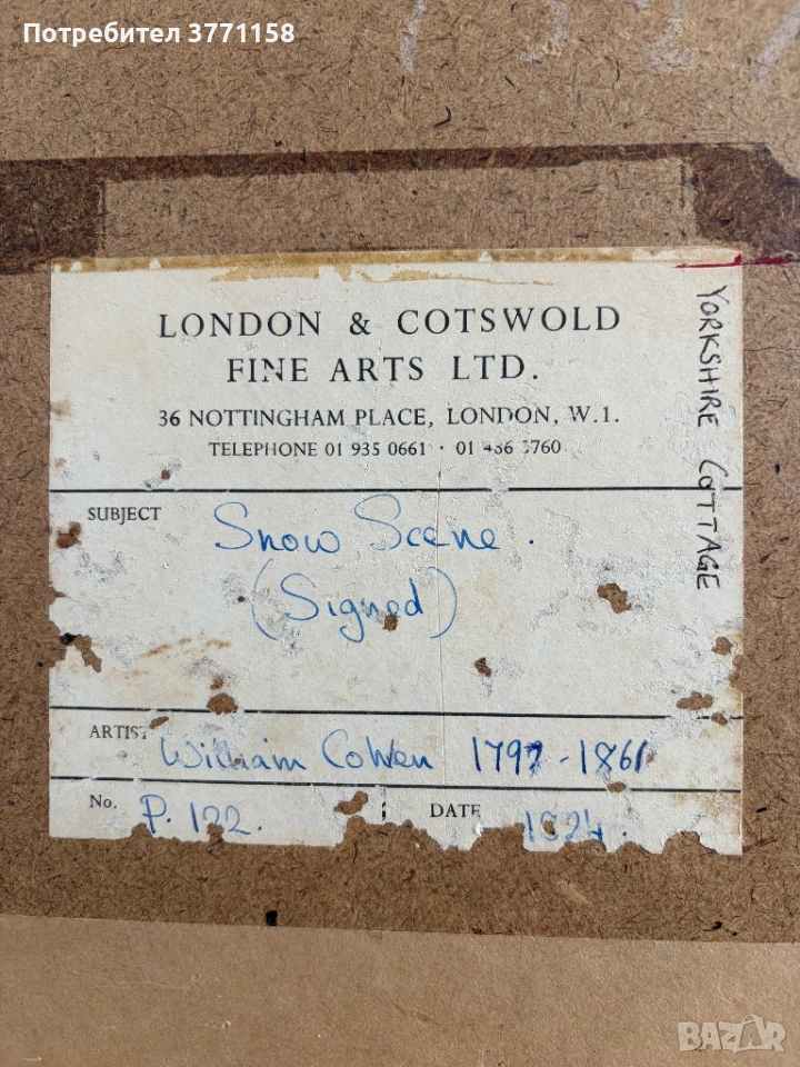 На гърба на картината е наличен оригинален етикет от престижната лондонска галерия"London & Cotswold Fine Arts Ltd."(36 Nottingham Place, London).
