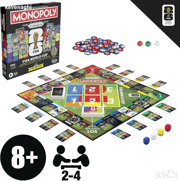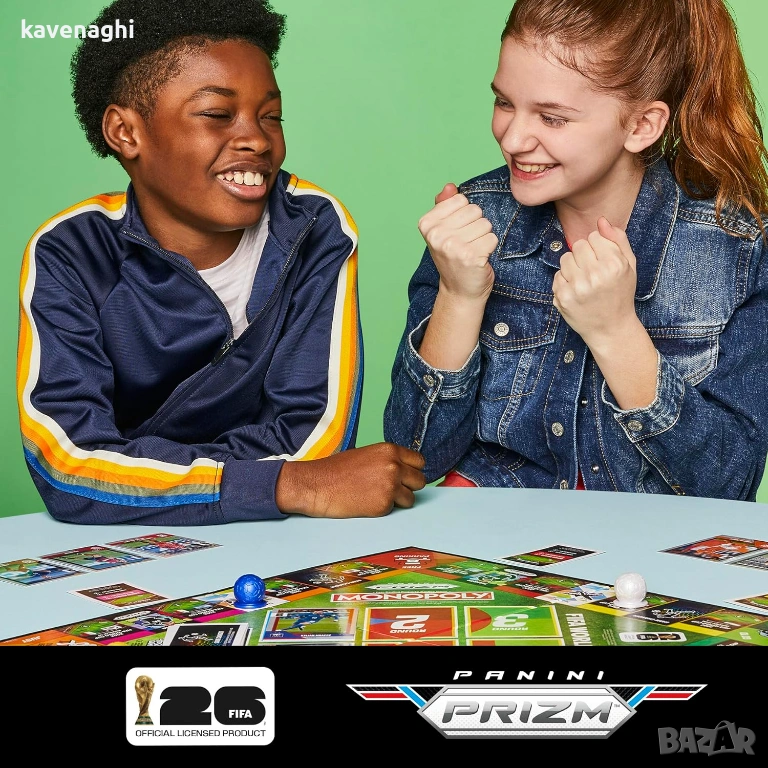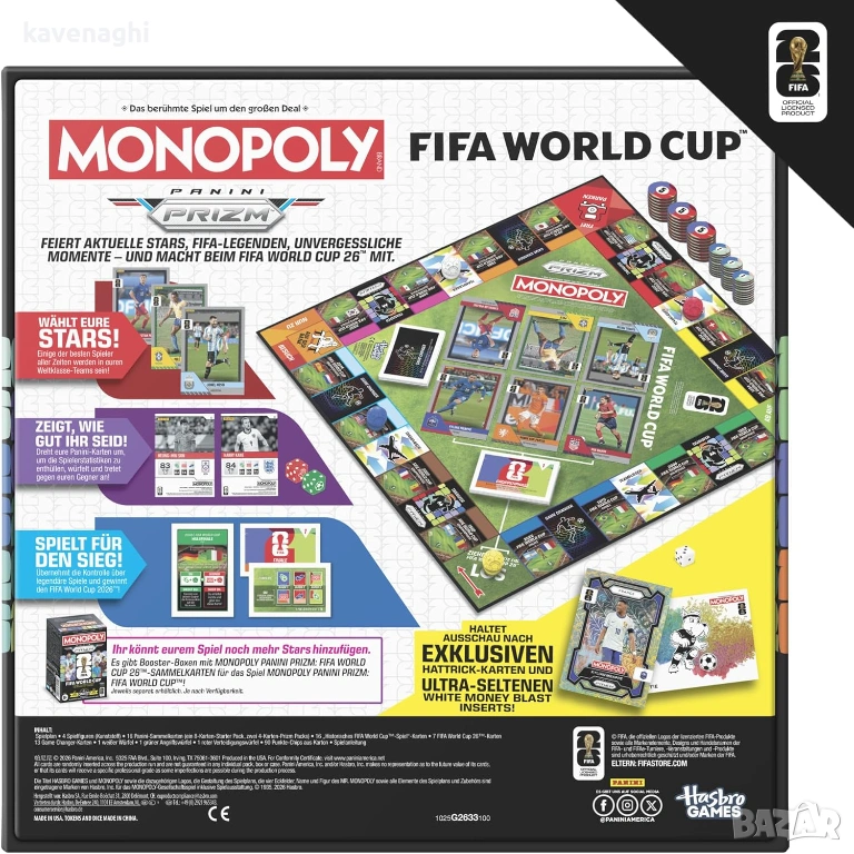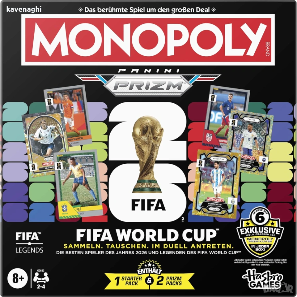 С Monopoly Panini Prizm: FIFA World Cup можете да се насладите на настоящи звезди, легенди на FIFA World Cup и незабравими моменти, докато самите играчи се състезават на FIFA World Cup 2026. В тази версия на Monopoly всеки играч избира футболни звезди от картите Panini, за да сглоби отбор от световна класа. След това играчите се движат по игралното поле, опитвайки се да съберат колкото се може повече исторически мачове от FIFA World Cup! Вие печелите точки от противниците си, когато те попаднат на тези мачове, като сравнявате статистиката на картите Panini и хвърляте специални зарове. За да спечелите още повече точки, можете да победите други играчи в предизвикателствата Game Changer и дори да участвате в FIFA World Cup 26. Играчът с най-много точки в края на играта печели! Търсите забавна игра за семейна игрова вечер или готин подарък за деца, тийнейджъри, ученици или възрастни? Тази стратегическа настолна игра за футболни фенове е отличен избор. За 2 до 4 играчи, на възраст 8 и повече години