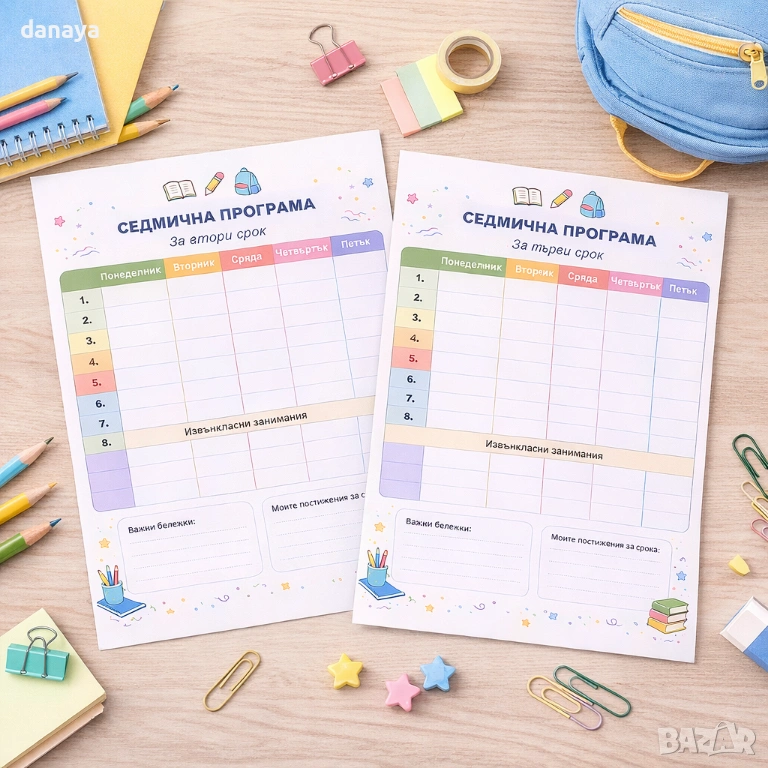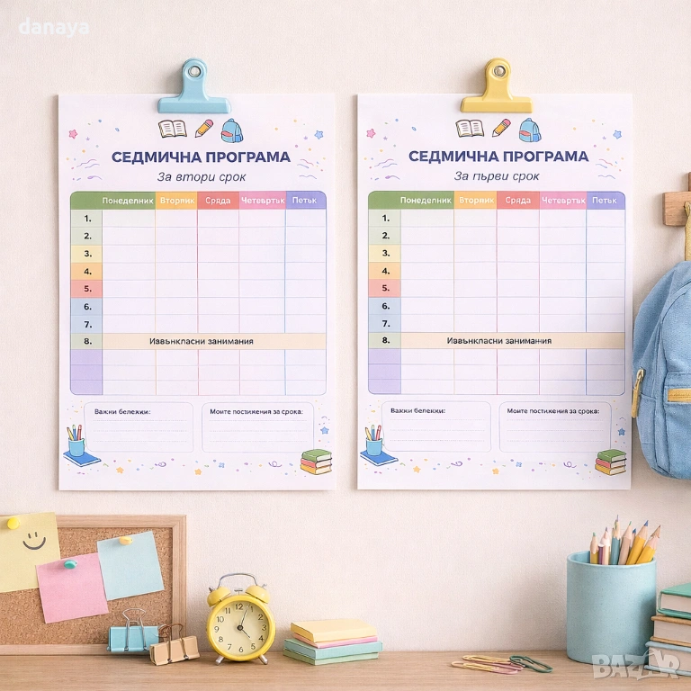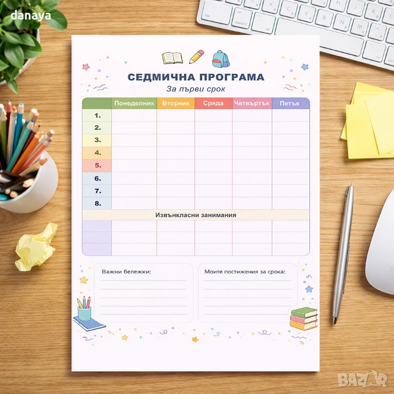 Седмична програма за училище А4, ученически планер за седмицата, двустранна ученическа програма – създадена не просто да записваш часове, а да направи учебния ден по-лесен, по-ясен и по-спокоен за детето.