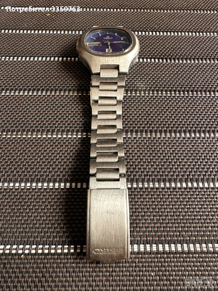 Продавам оригинален винтидж часовник Seiko 5 Automatic с уникален синьо-лилав циферблат и характерна ретро каса от 70-те години.
