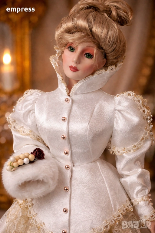 Лицето е изработено от фин порцелан с ръчно рисувани черти и изразителни очи, а прическата е оформена в елегантен винтидж стил.