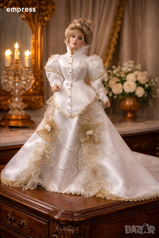 Облечена е в великолепна зимна булчинска рокля от блестящ сатен и богата дантела със златни акценти, перлени детайли и декоративни елементи. Роклята е допълнена с изискан маншон, който подчертава зимната тематика и придава допълнителен аристократичен чар.