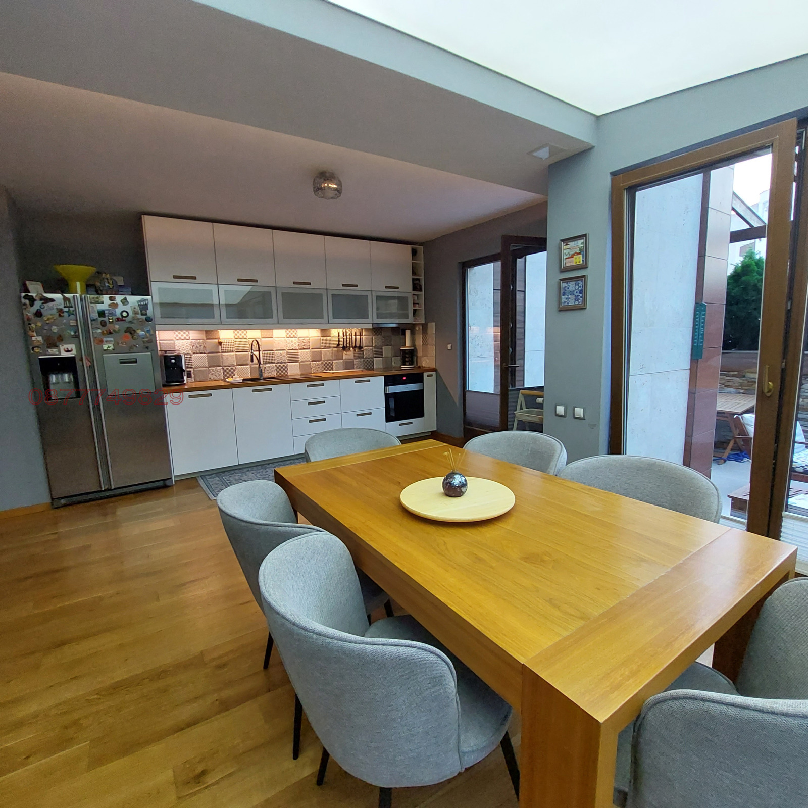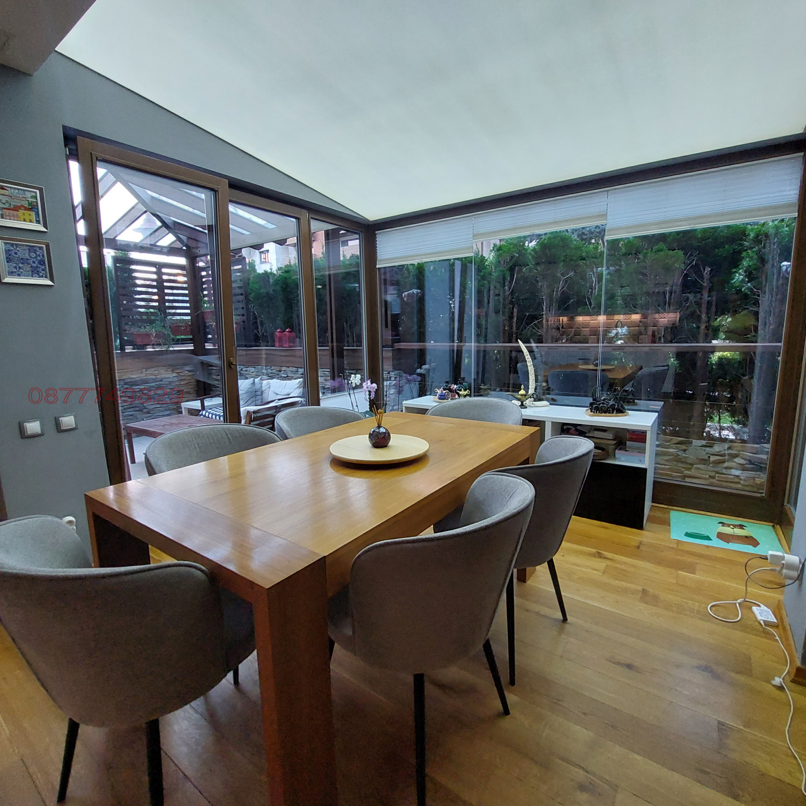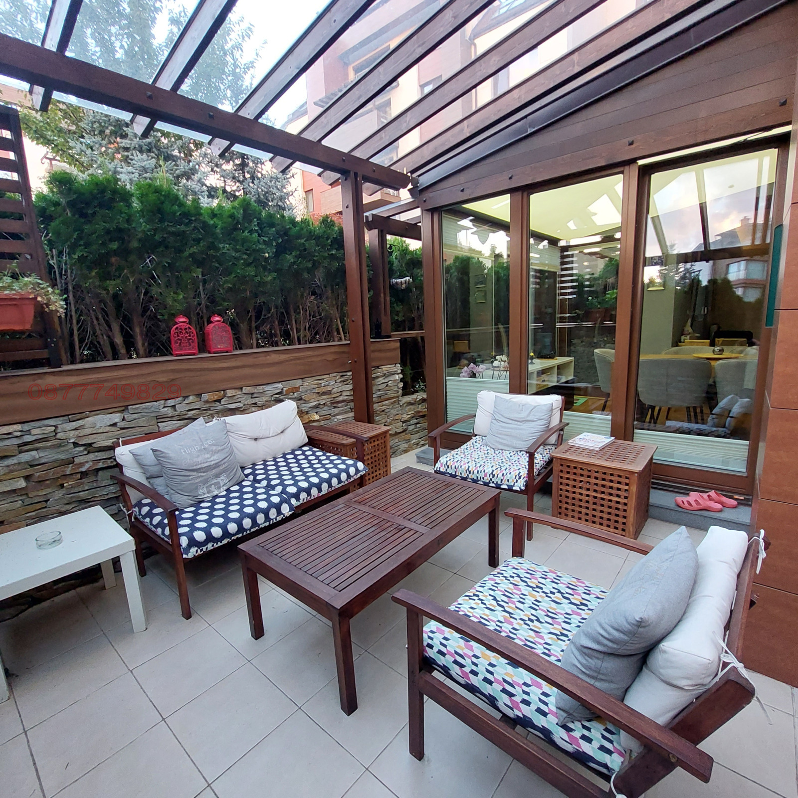 Комплекс Флора Парк (Flora Park). Предлагам Ви МЗОНЕТ на ниво партер и 1-ви ет., със собствен двор и отделна тераса. Напълно обзаведен апартамент с прекрасна гледка към вътрешността на комплекса, находящ се зад мол България. Жилището разполага на ниво партер с антре, трапезария с кухня, холна част, тоалетна за гости и дрешник. На 1-ви етаж има две отделни и просторни спални, едната със собствена баня и отделен дрешник. Трета баня с душ кабина и мокро. Към апартамента има паркомясто на ново - 1 включено в цената .