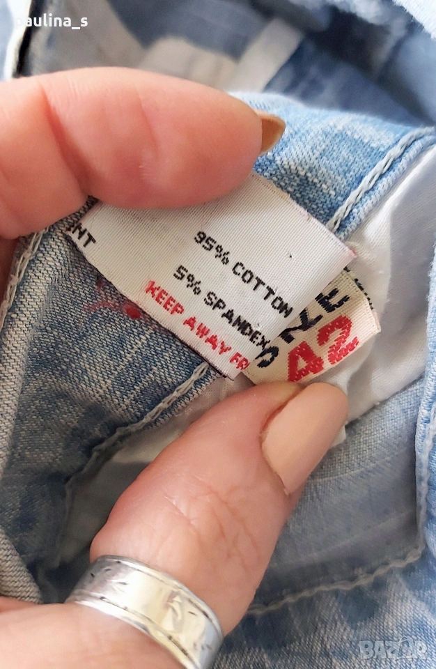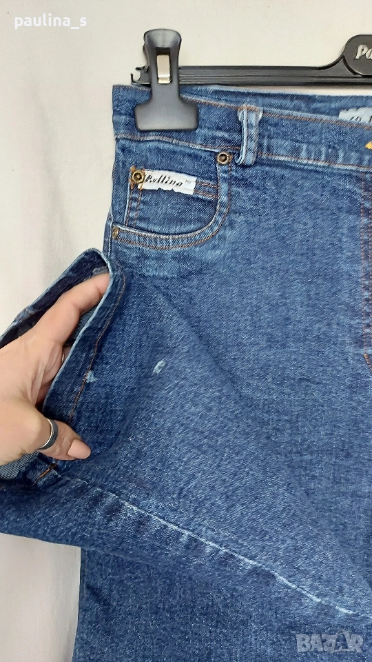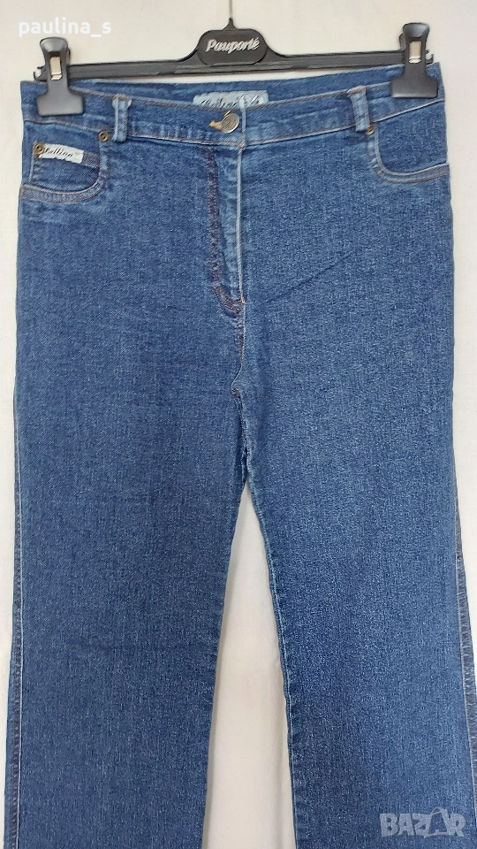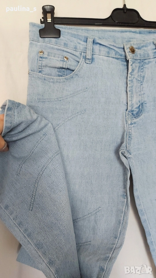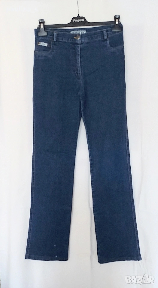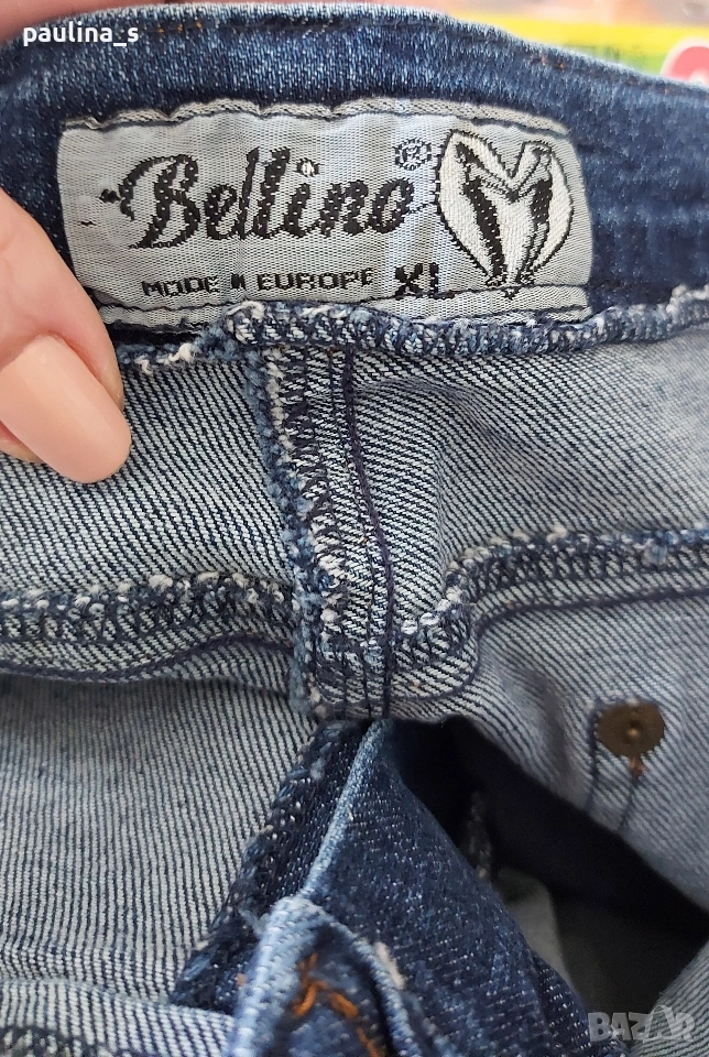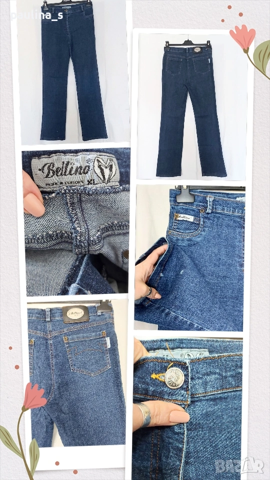1️⃣. Колаж / M / XL - "Bellino". Цената е крайна, без пазарлъци 10 евро. Еластични дънки с висока талия. Крачолите са леко широки, чарлстон. Моделът е 5 pocket Denim standard, една бройка са. Забележката се вижда добре на снимките, тя не пречи, може да се изпере - съобразена цена.