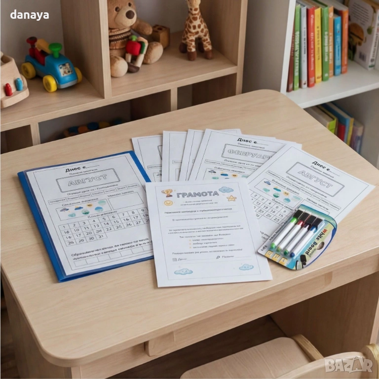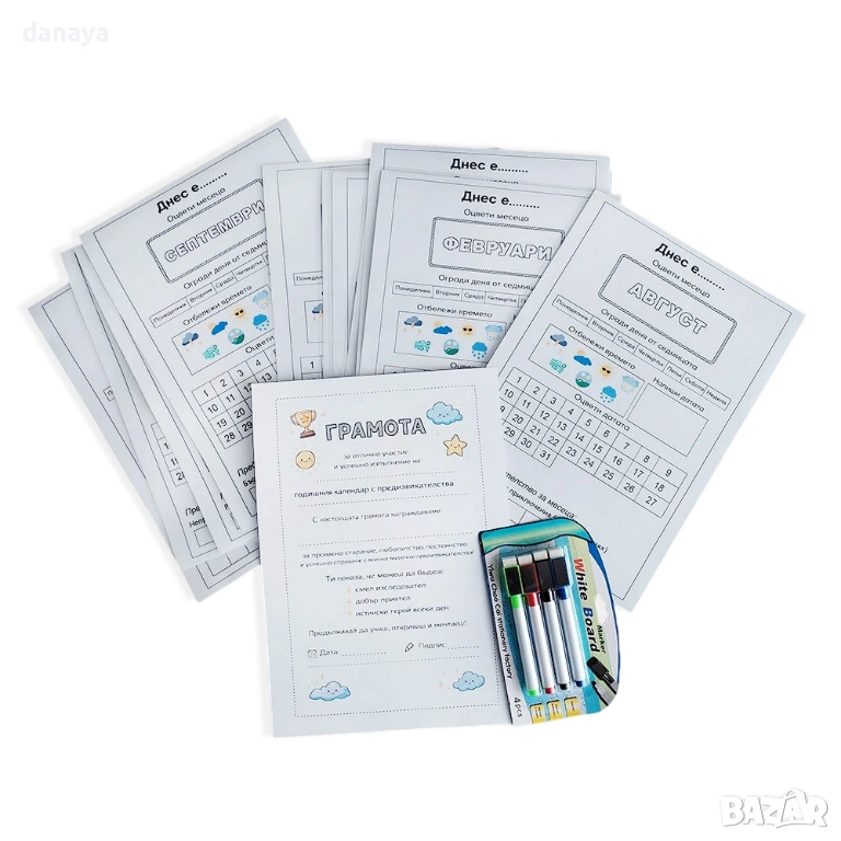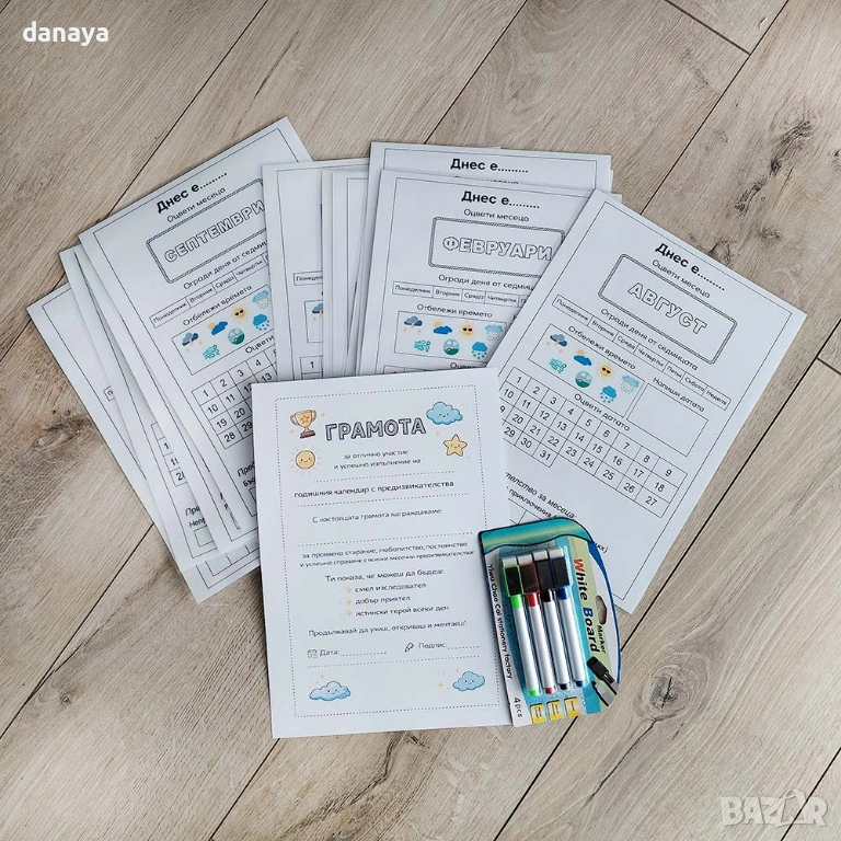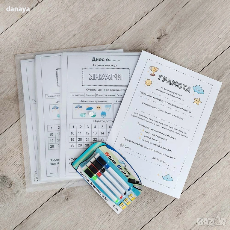 Образователен календар за деца, ламинирани работни листи с месеци и предизвикателства – комплект, който превръща всеки ден в игра, учене и малка победа.