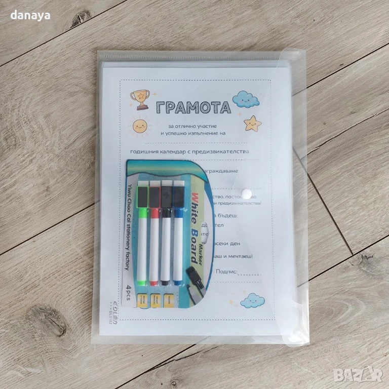 Всичко е подредено в практична прозрачна папка с копче – лесно за съхранение, пренасяне и подаряване.