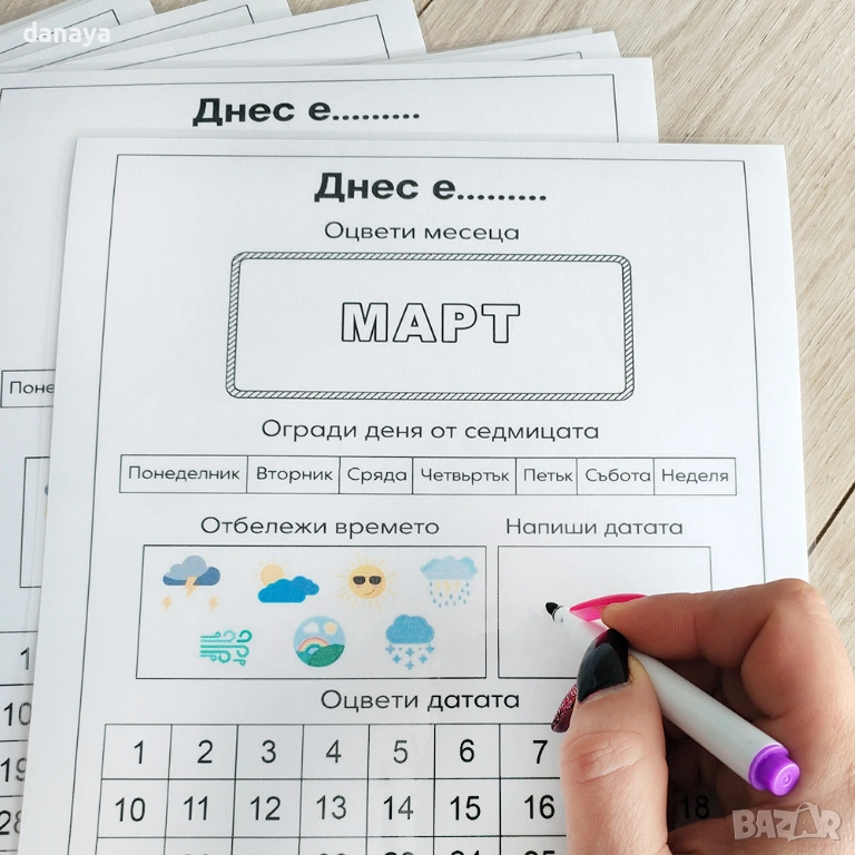 Това не е просто календар. Това е начин детето да се научи да разпознава месеците, дните от седмицата, времето и датите – самостоятелно, с интерес и желание. Всеки лист води детето през деня с ясни и забавни задачи – да отбележи времето, да напише датата, да огради деня и да оцвети месеца.