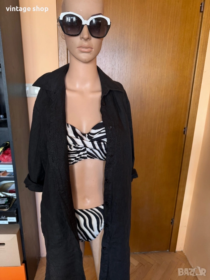 С джобове за комфорт, с възможност за навиване на ръкавите. С дълбоки странични цепки. С копчета по цялата дължина. Перфектна за плаж с бански, в който има черна тоналност, визия, издържана в класически и непреходен дизайн- черно и бяло.