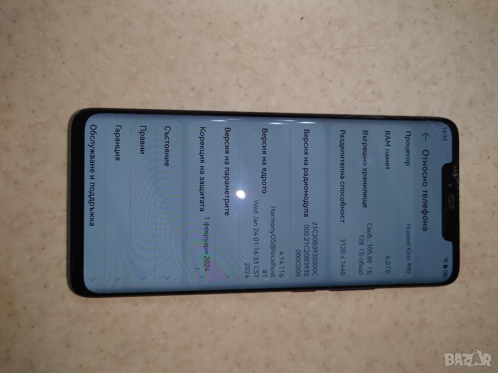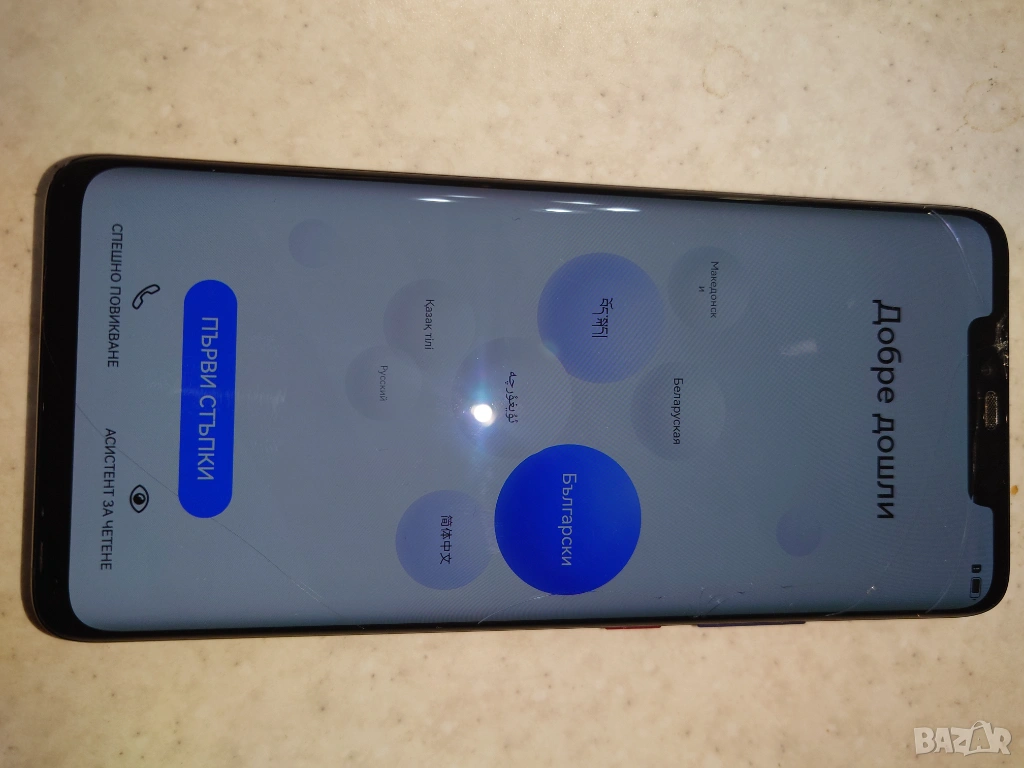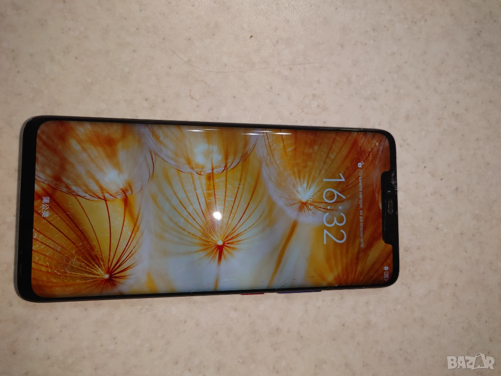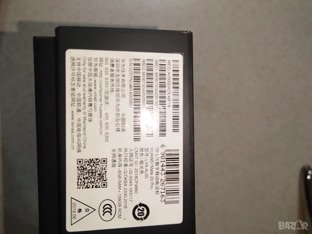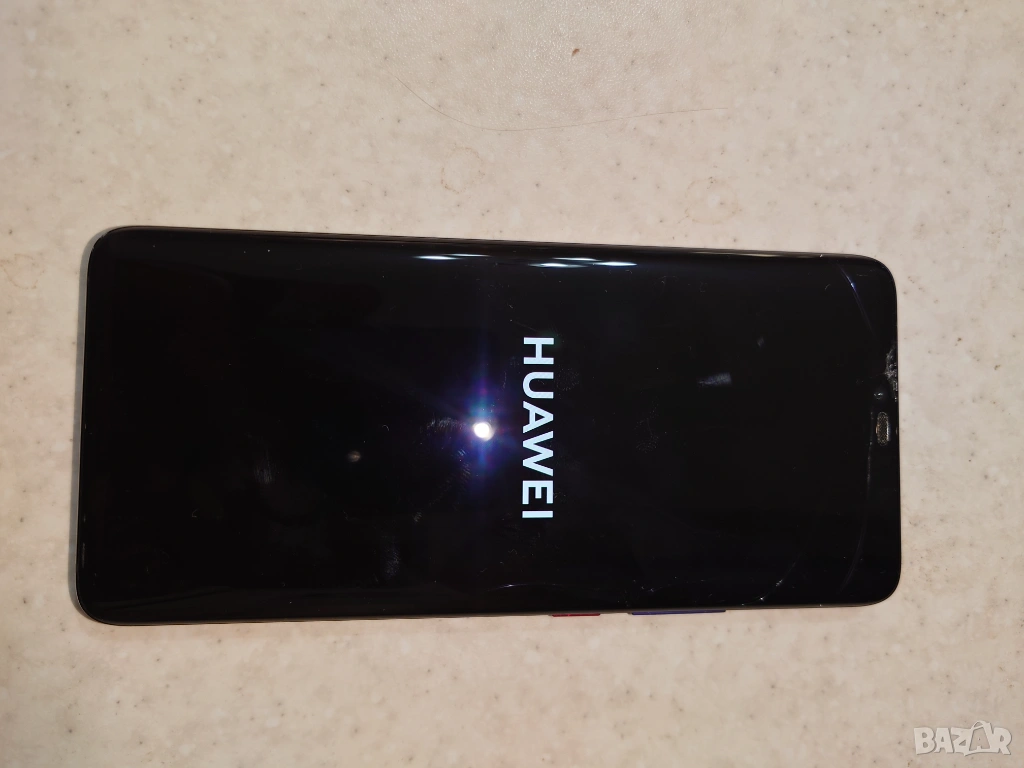 Продавам Huawei Mate 20 Pro - китайска версия, работи с всички оператори. Телефонът има леко спукване на стъклото в горната част/снимал съм го/, иначе всичко работи без проблем. Продава се в оригиналната опаковка без зарядно и кабел.