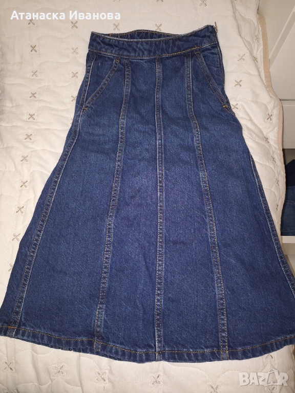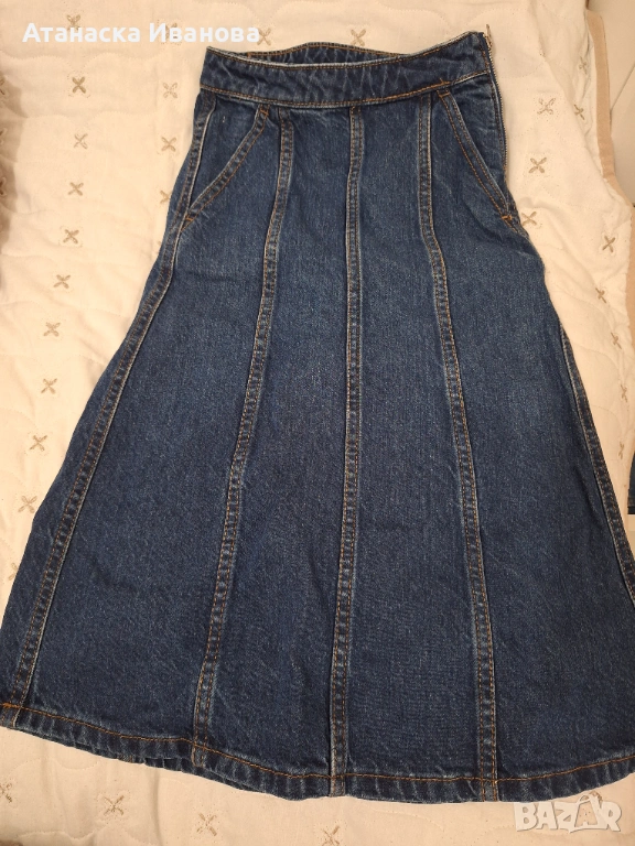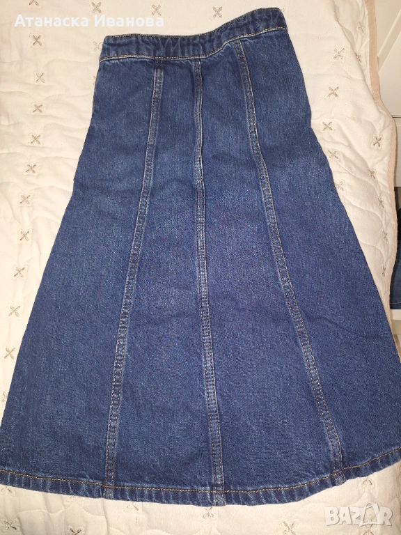 Дълга дънкова пола за госпожици, закопчава се с цип отстрани, отпред има джобове, с възможност за стесняване на коланчето отвътрешната страна. Без никакви забележки слагана 2-3 пъти.