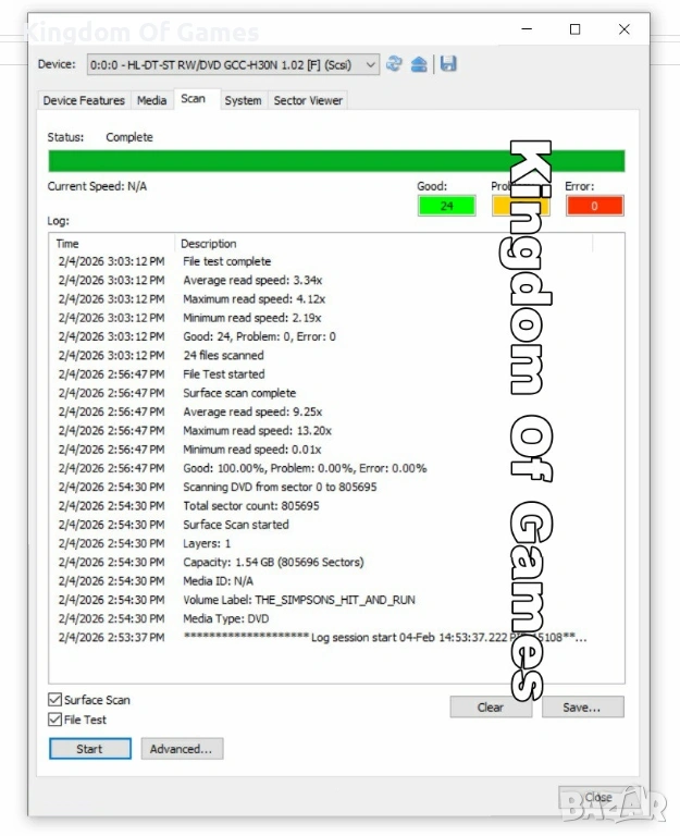 Освен това, е тествана и с програма. Програмата, прави два теста: Surface Test(повърхностен тест) и File Test(файлов тест), при което е