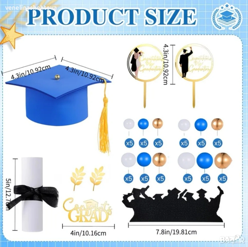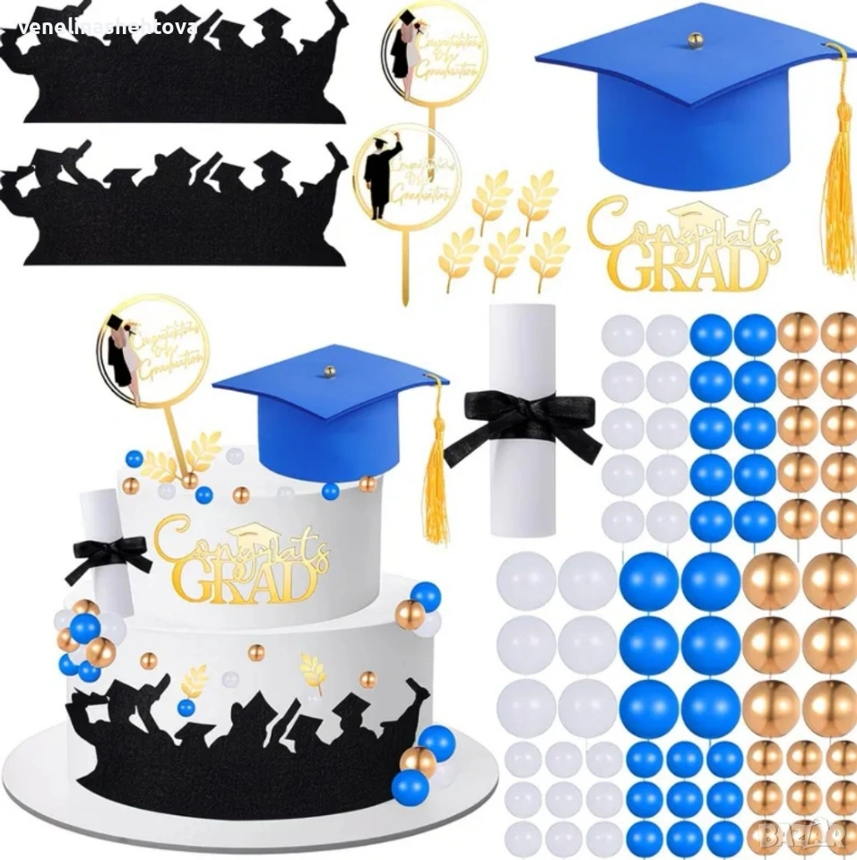 Congrats Комплект топери диплома шапка топчета за декорация на торта абитуриентски бал → Обява 54099965