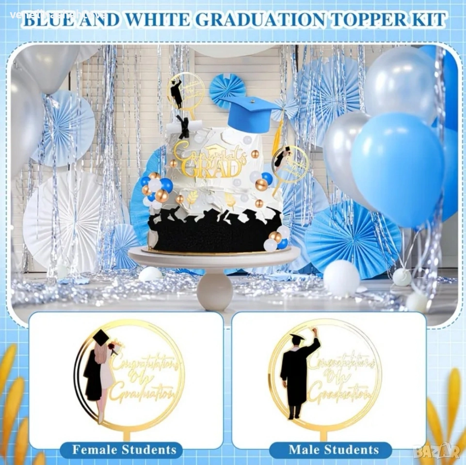 Комплект от 67 части за пълна декорация на торта за абитуриентски бал в син цвят