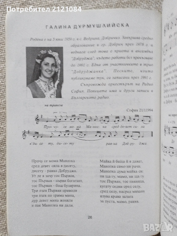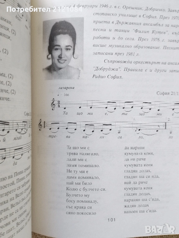 Народни добруджански изпълнители и песни с текстове и кратки нотни полета из репертоара им.
