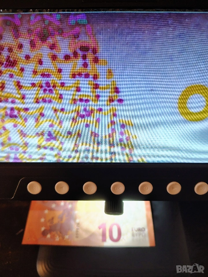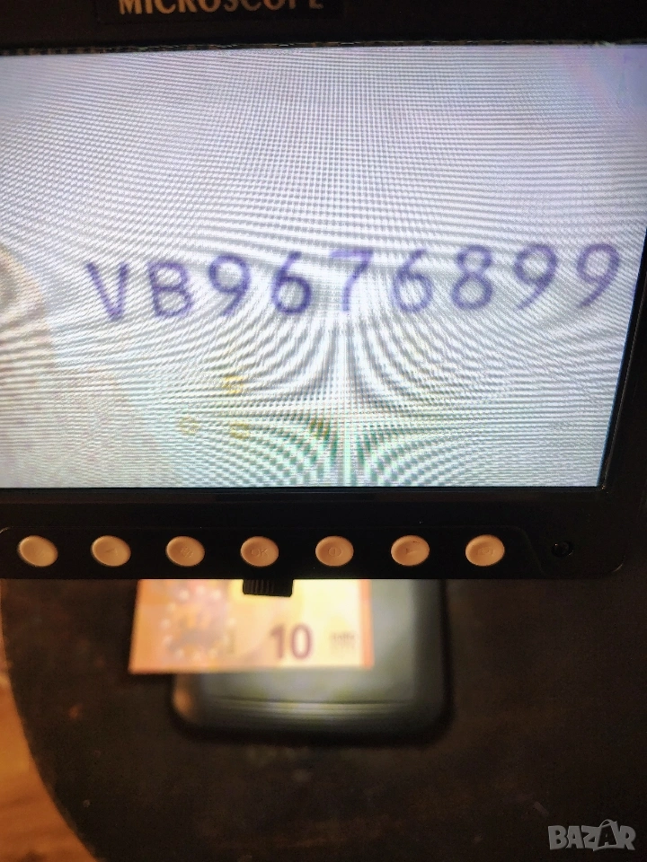 На снимките можете да видите как изглежда банкнота от 10 евро на най-малкото и най-голямото увеличение, както и листо на почти най-голямото увеличение.